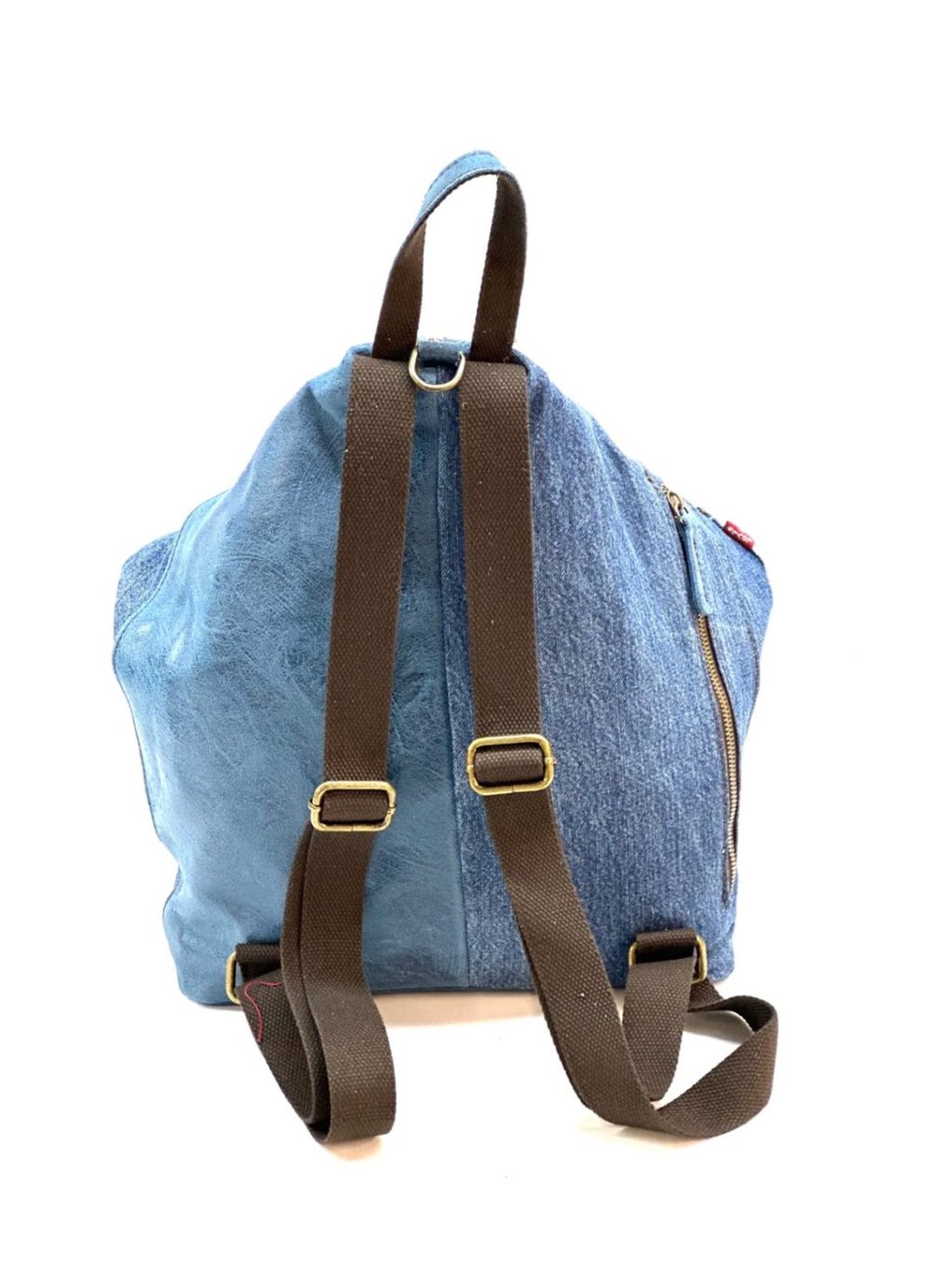 Tento jedinečný batoh vznikl z pečlivě vybraných džínových kalhot, kterým byl vdechnut nový život. Každý kousek je ručně šitý originál – žádný není stejný. Praktický a prostorný střih s pevným dnem, hlavním zipovým zapínáním a nastavitelnými popruhy nabízí nejen styl, ale i funkčnost. Designové prvky jako kovové cvočky, zip uprostřed nebo zachované kapsy dodávají batohu šmrnc a osobitost. Ideální na volný čas, výlety i městské pochůzky.
