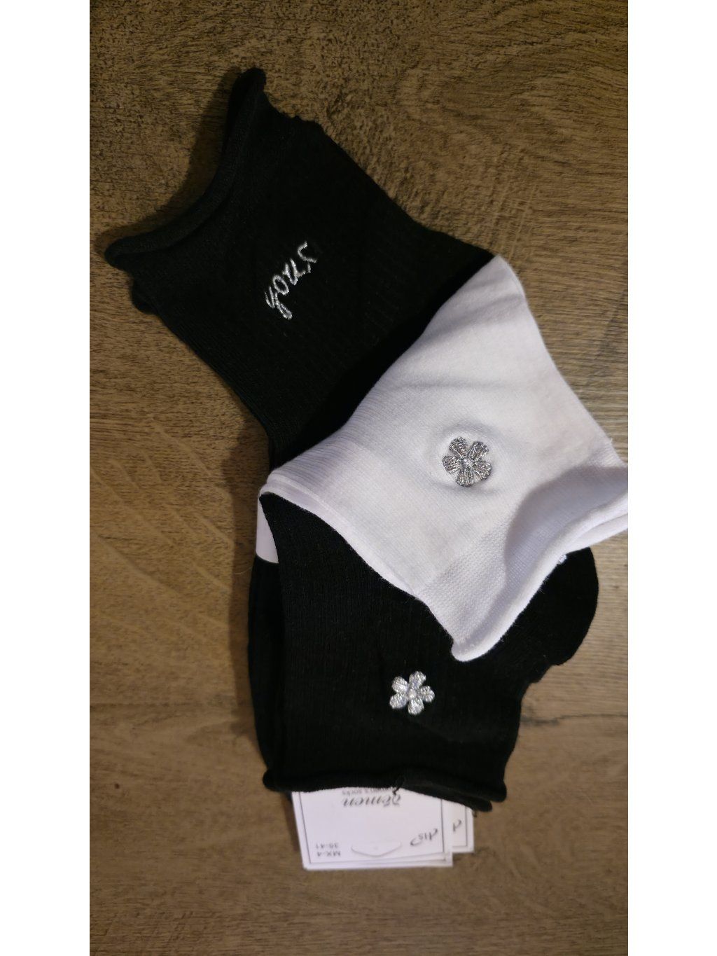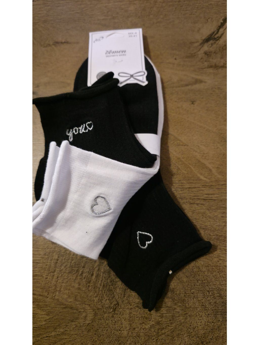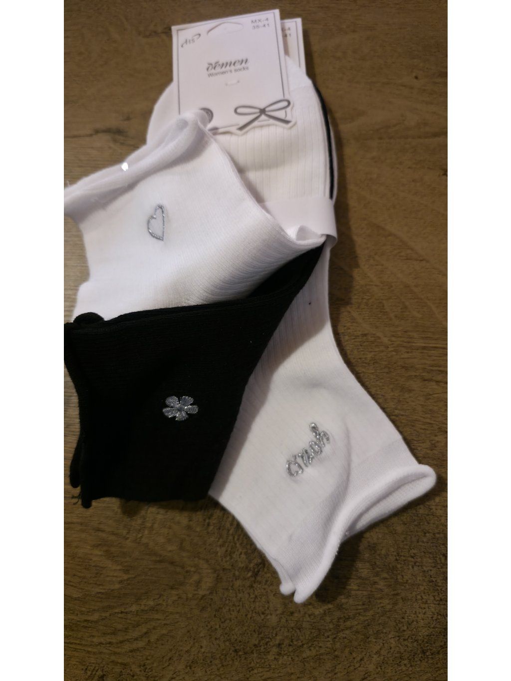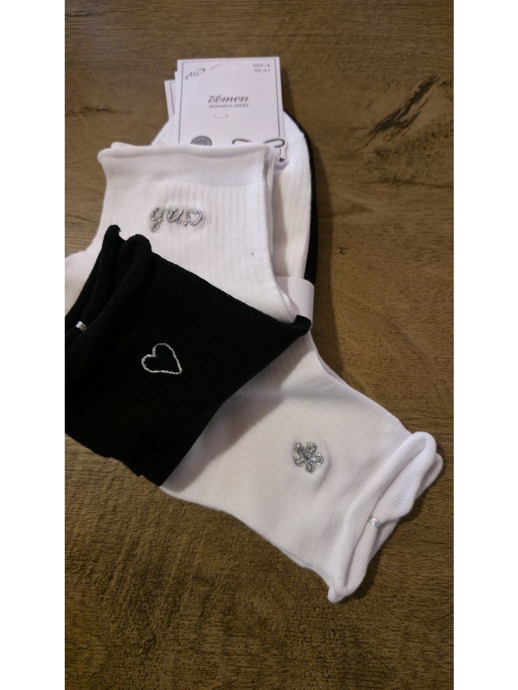 Stylové ponožky s jemnými detaily – nápisy, srdíčka a třpytivé prvky, které doladí každý outfit.