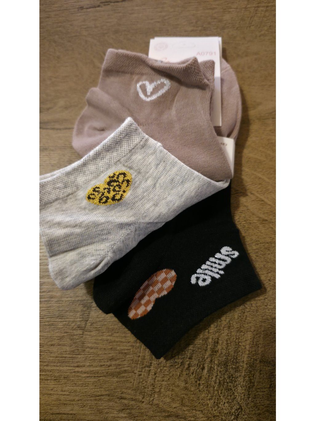 Stylové ponožky s jemnými motivy srdíček a nápisem smile – pohodlí, které ti zlepší den.