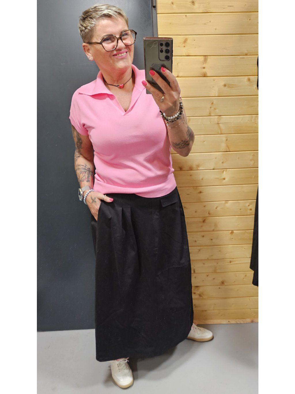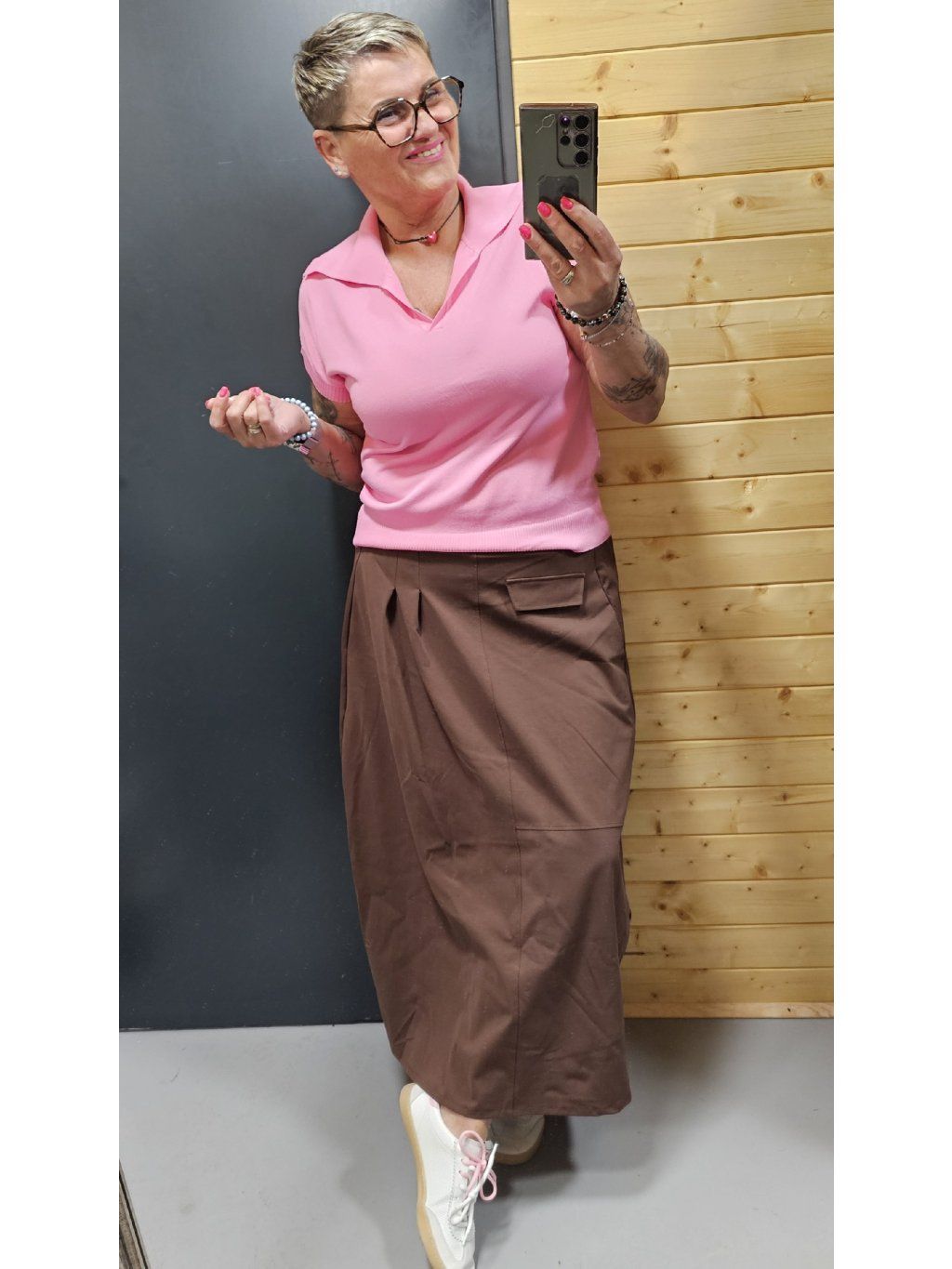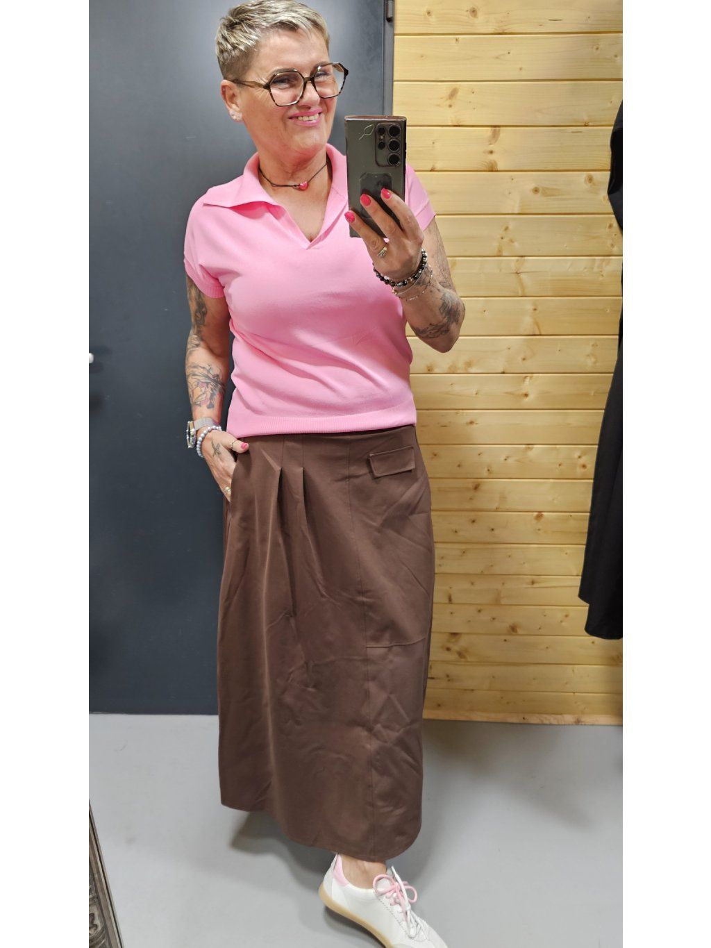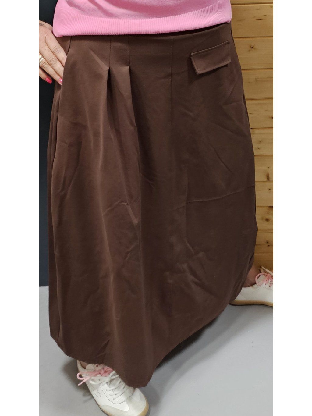 Pohodlná áčková sukně z elastického materiálu s gumou v pase, dvěma bočními kapsami a ozdobnou klopovou kapsičkou vpředu. Styl i komfort v jednom.