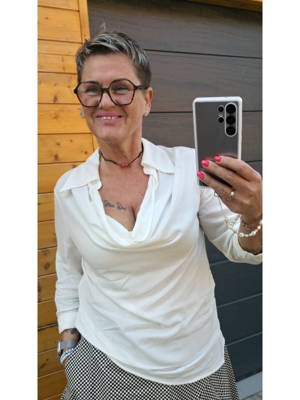 Díky splývavému materiálu a asymetrickému střihu je halenka vhodná pro postavy jablko, hruška i přesýpací hodiny. Volnější střih jemně zakrývá oblast bříška a krásně prodlužuje siluetu.