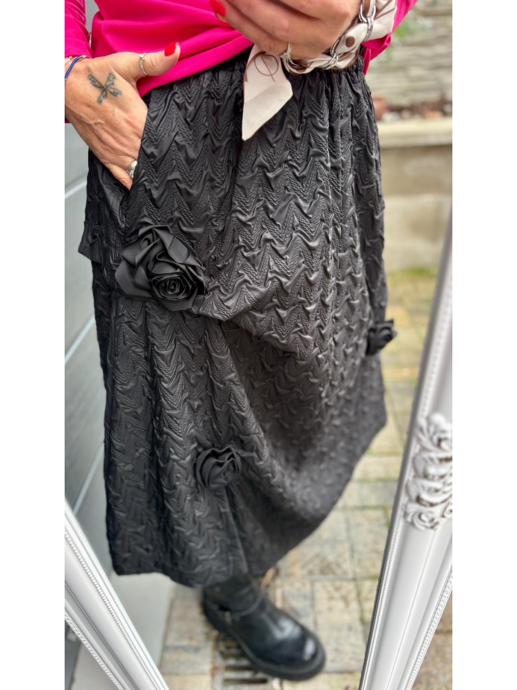 Originální černá sukně s plastickým strukturovaným vzorem a květinovými aplikacemi vpředu. Asymetrická délka, elastický pas, pohodlí i elegance v jednom.