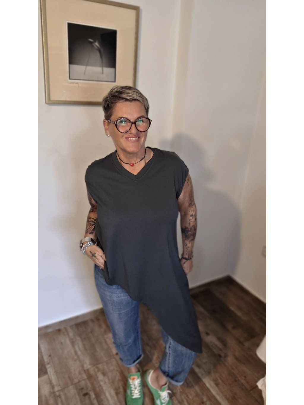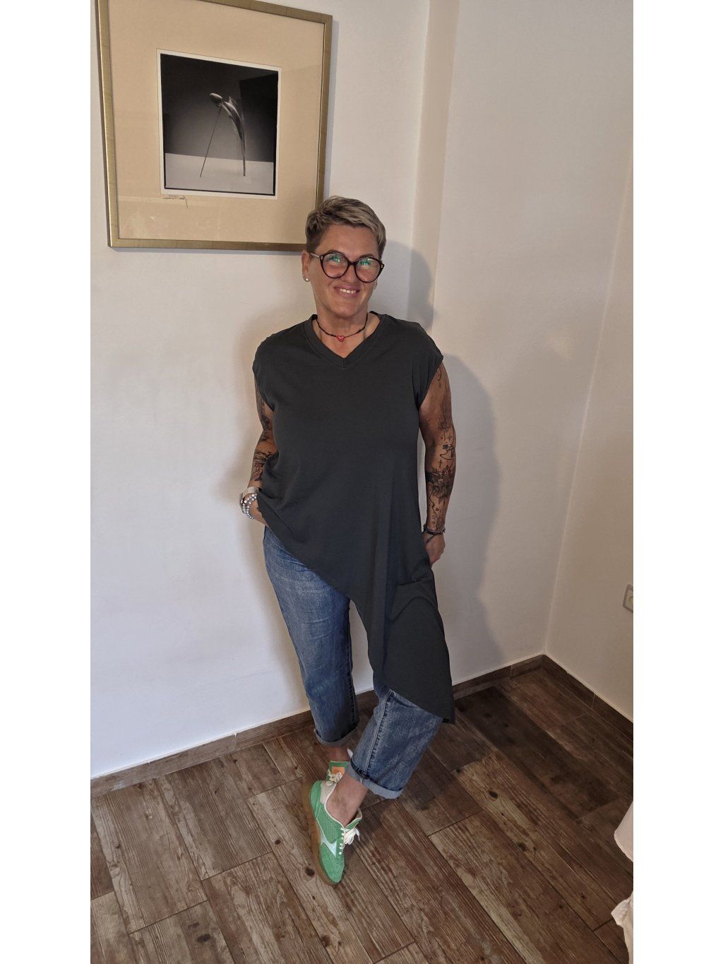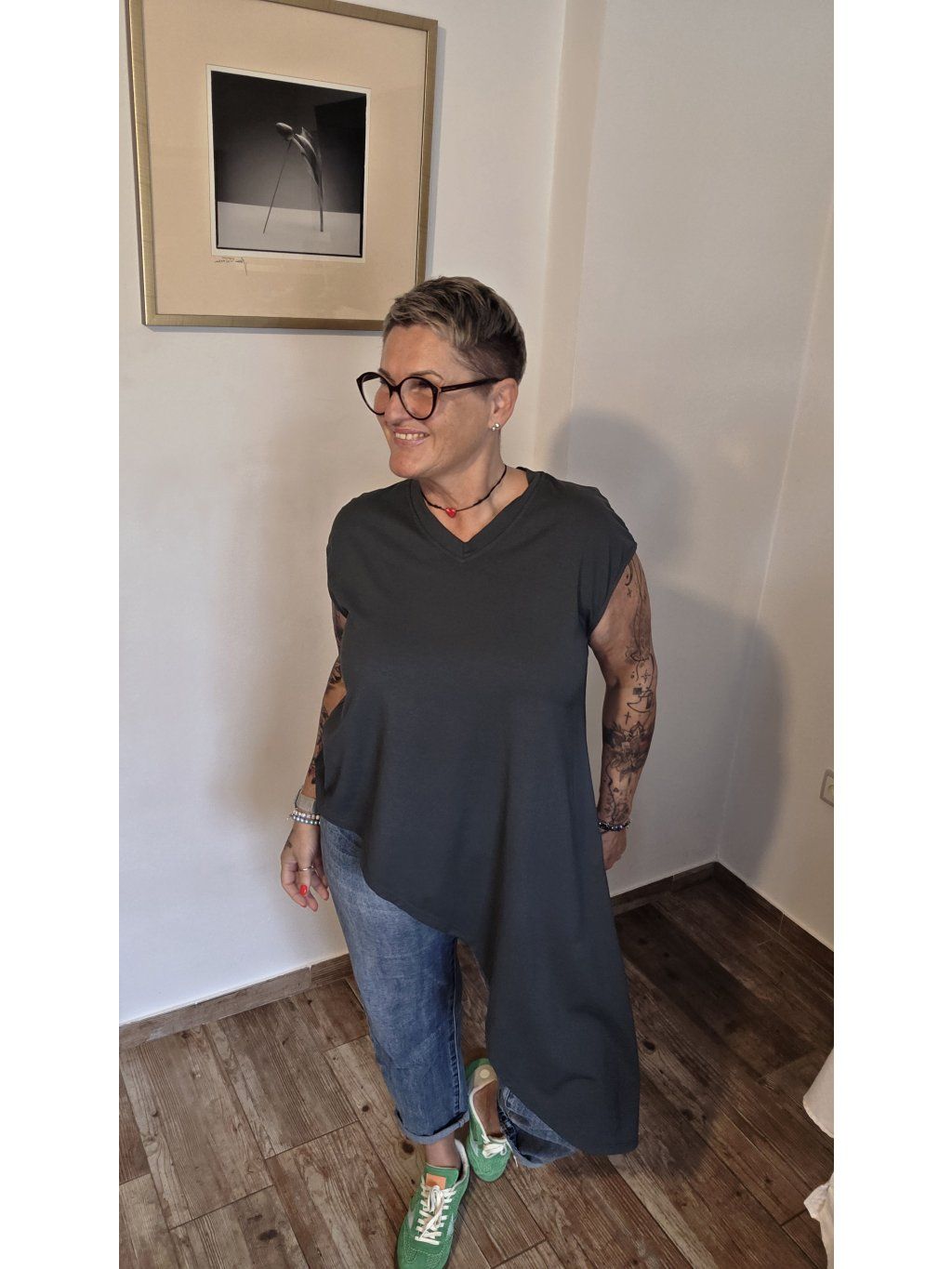 Lehká asymetrická tunika s výrazně prodlouženou zadní částí. Elegantní, pohodlná a neskutečně lichotivá