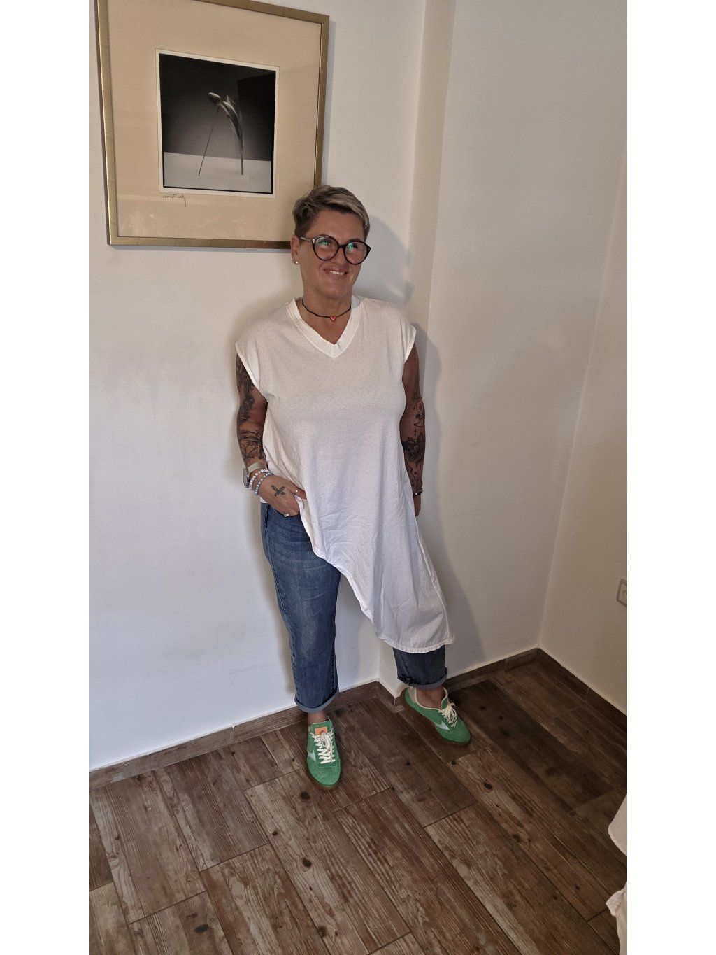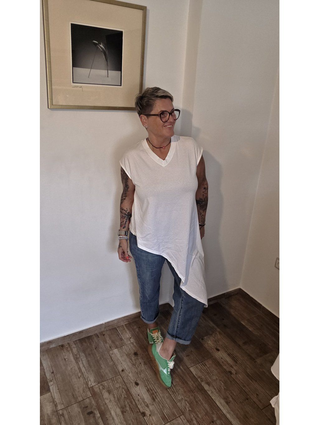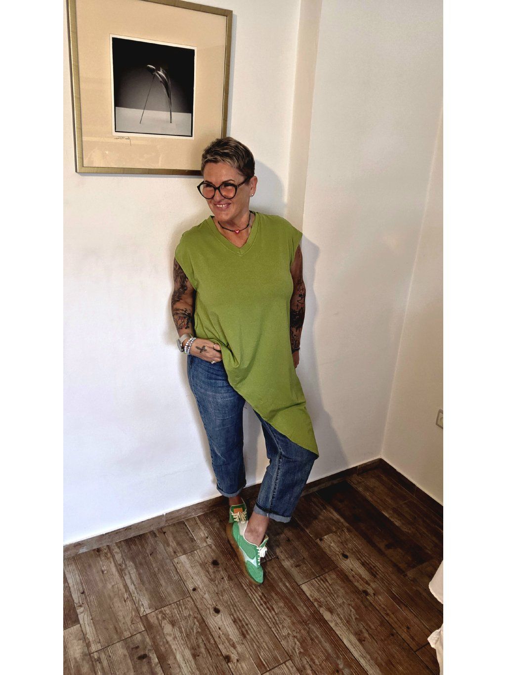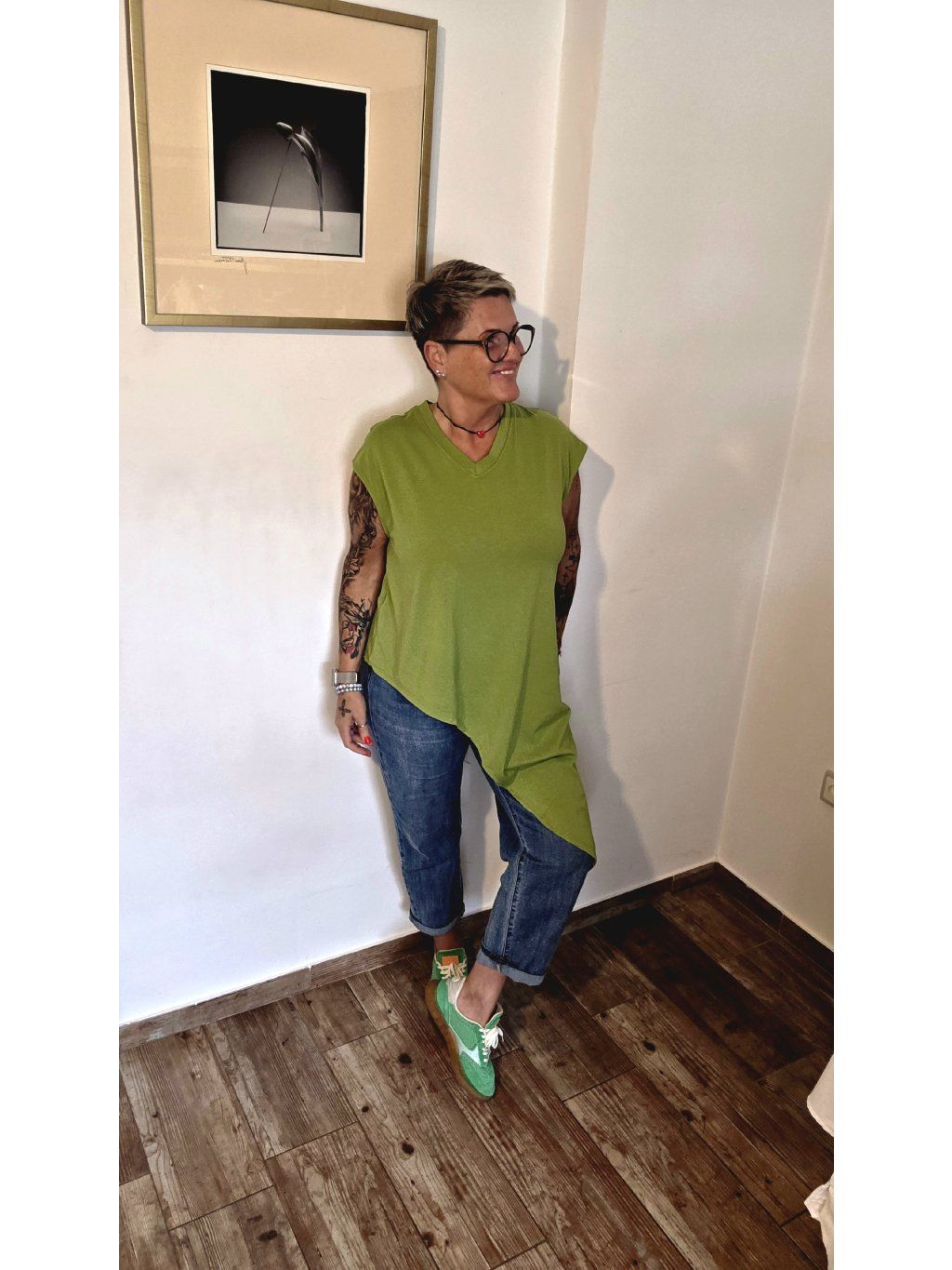 Lehká asymetrická tunika s výrazně prodlouženou zadní částí. Elegantní, pohodlná a neskutečně lichotivá