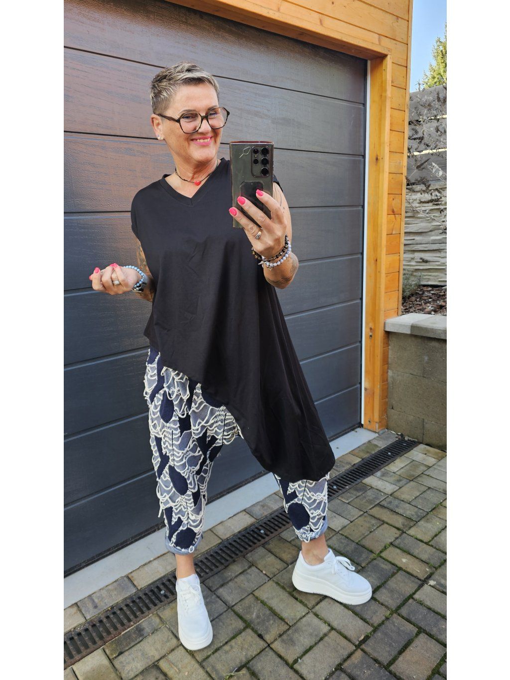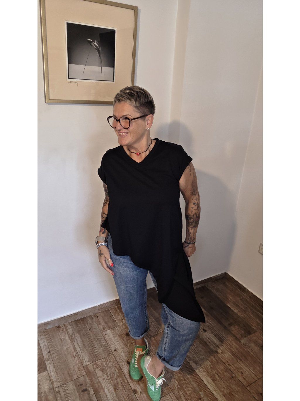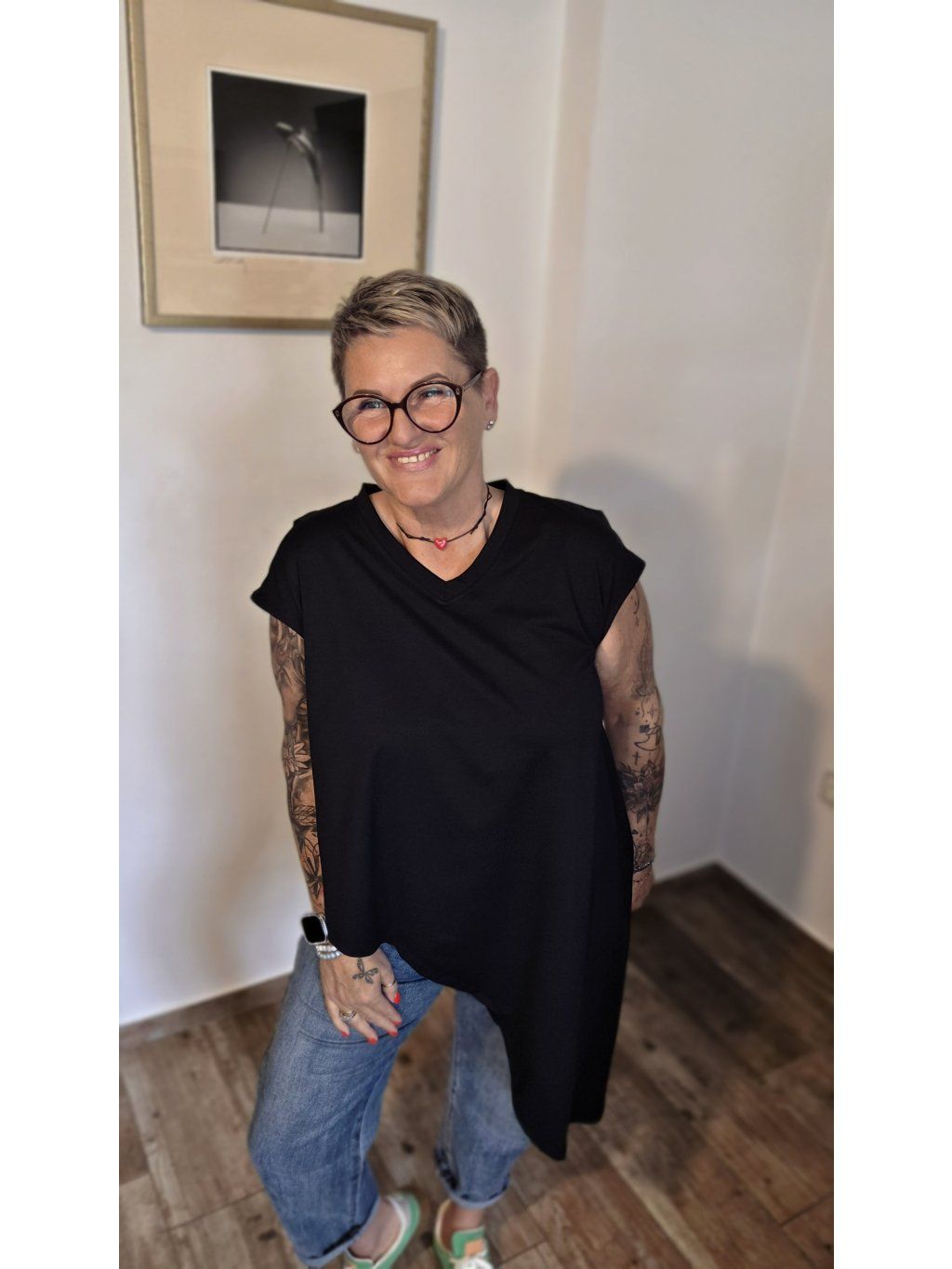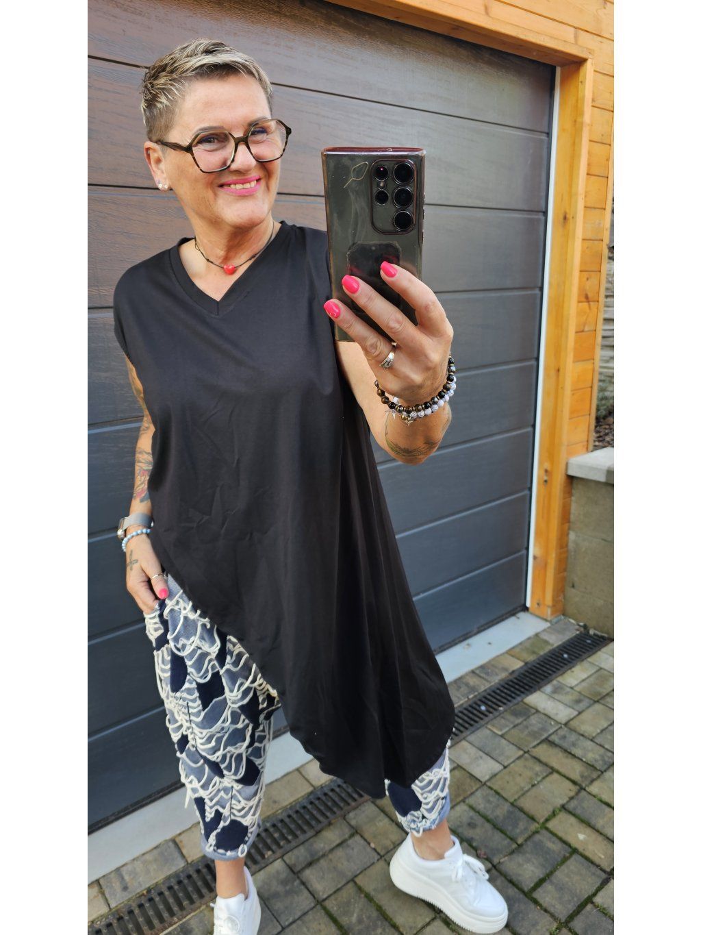 Tahle černá asymetrická tunika je přesně ten kousek, který zachrání každý outfit. Přední část je kratší, zadní výrazně prodloužená a krásně splývá při chůzi. V pohybu působí lehce, žensky a sebevědomě.