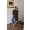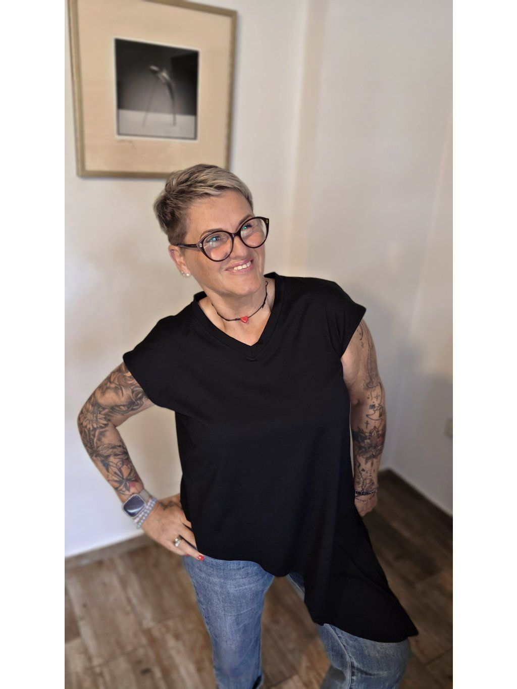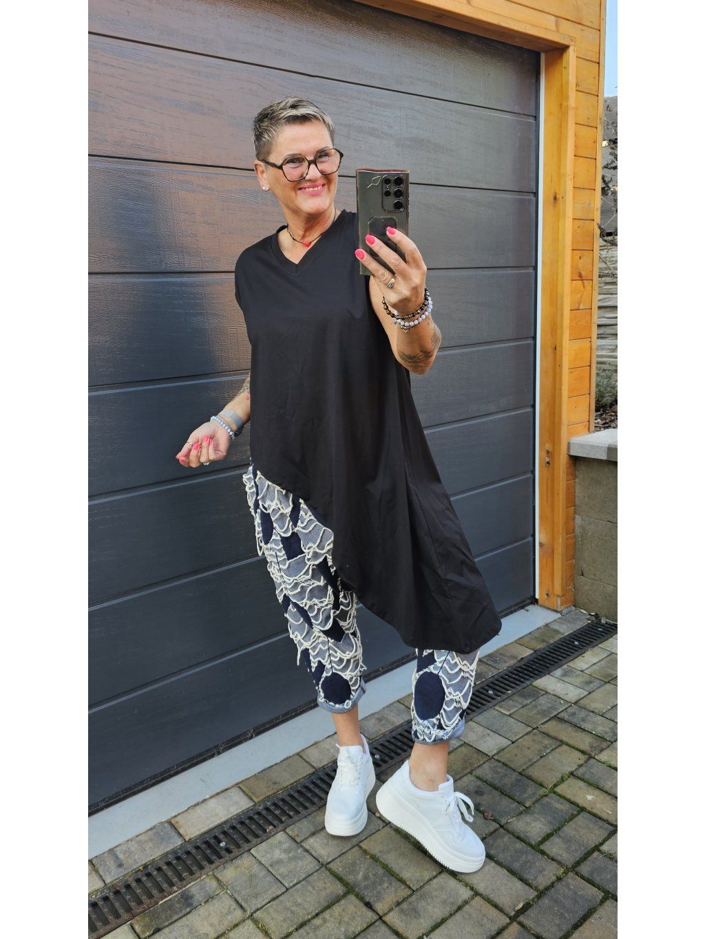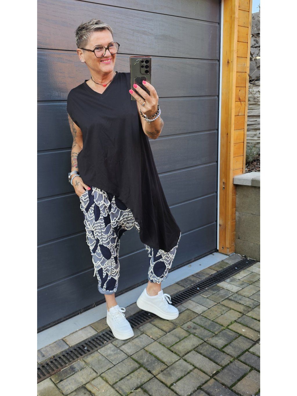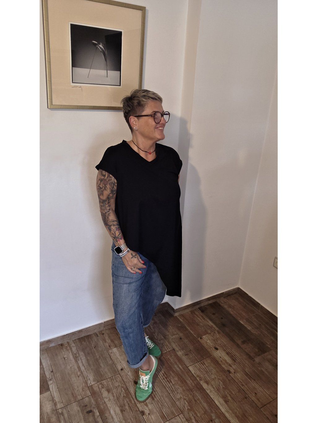 Tahle černá asymetrická tunika je přesně ten kousek, který zachrání každý outfit. Přední část je kratší, zadní výrazně prodloužená a krásně splývá při chůzi. V pohybu působí lehce, žensky a sebevědomě.