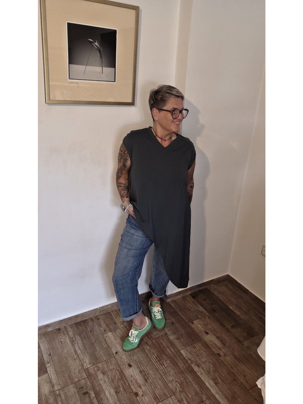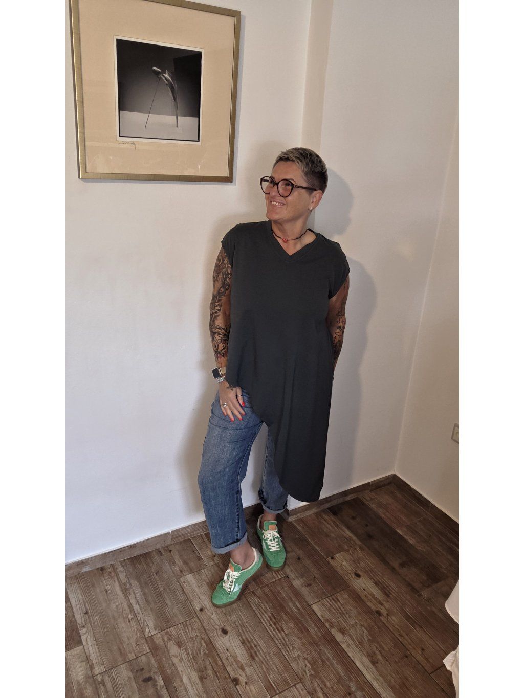 Je to model, který můžeš nosit jako delší top, tuniku nebo lehké vrstvení přes kalhoty.