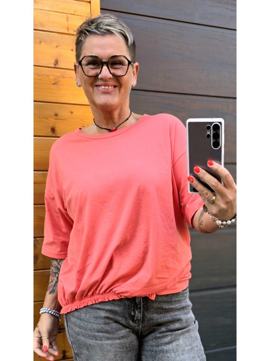 Pohodlné dámské tričko ze 100% bavlny s asymetrickým střihem a ozdobným lemem ve spodní části. Volný střih krásně splývá a díky gumě vytváří zajímavý efekt při nošení.