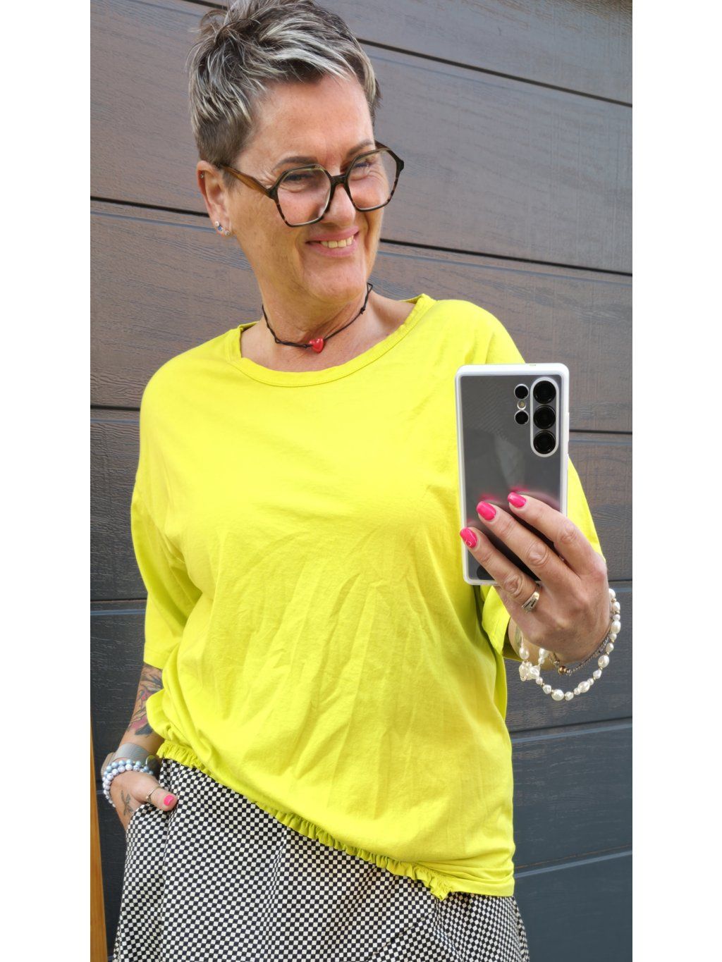 Ležérní, ale zároveň velmi stylové tričko, které zaujme především svým asymetrickým střihem a ozdobným spodním lemem. Spodní část je zakončena jemnou gumičkou, která vytváří přirozené řasení a zajímavý objem. Díky tomu tričko krásně padá přes boky a působí velmi ženským a uvolněným dojmem.