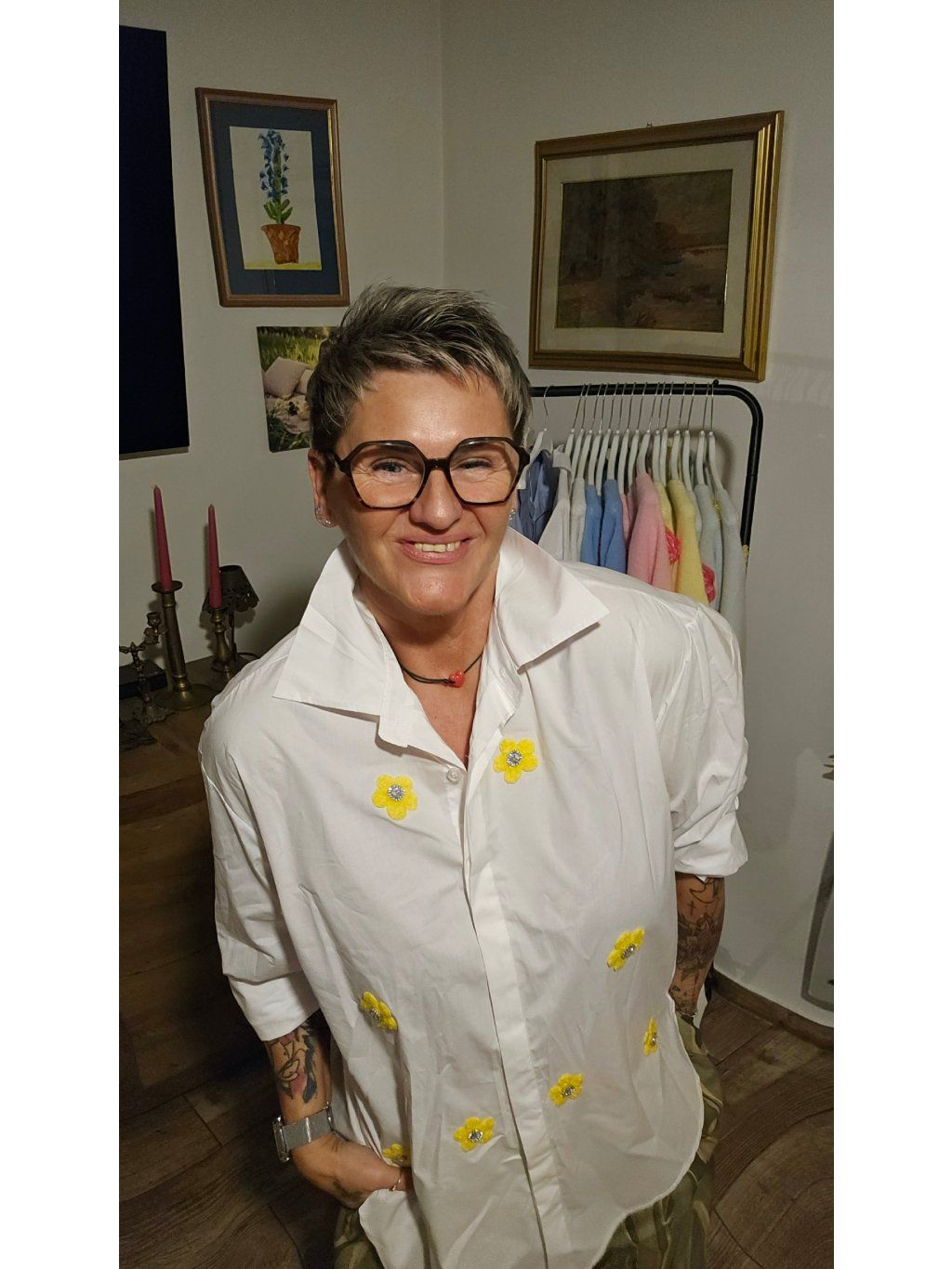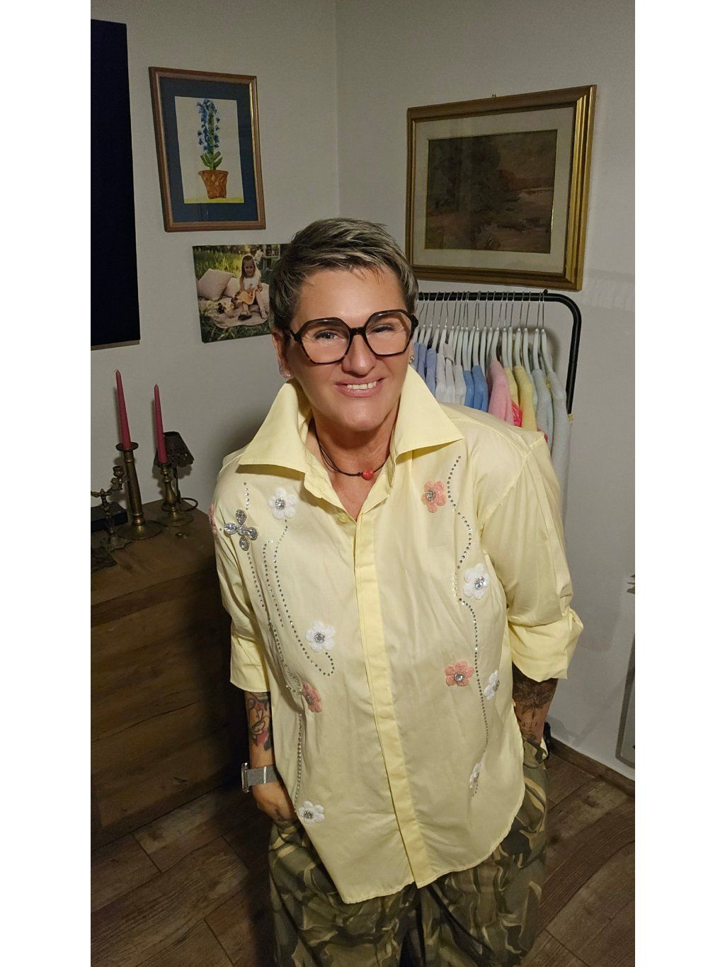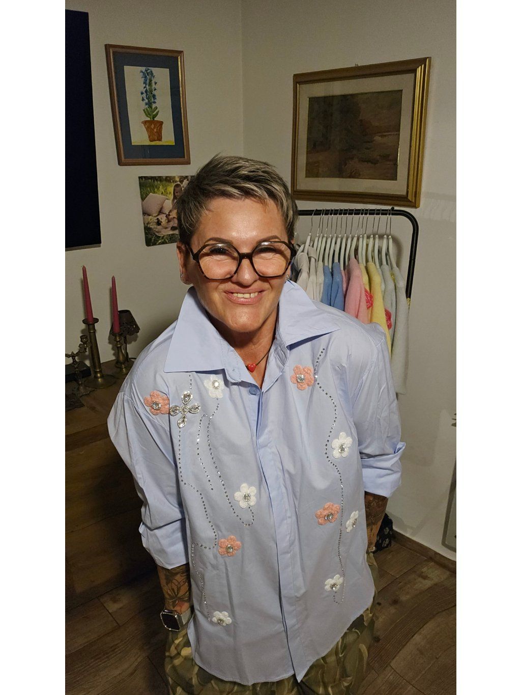 Každý kousek působí lehce jinak díky rozložení květin a kamínků – košile tak působí osobitě a ne masově. Přesně ten typ oblečení, který ti udělá radost pokaždé, když si ho vezmeš na sebe 🌸