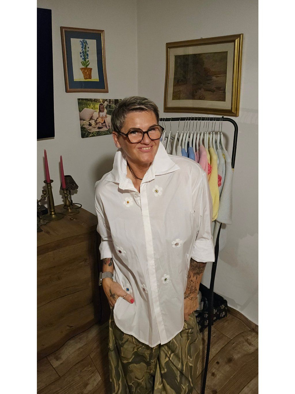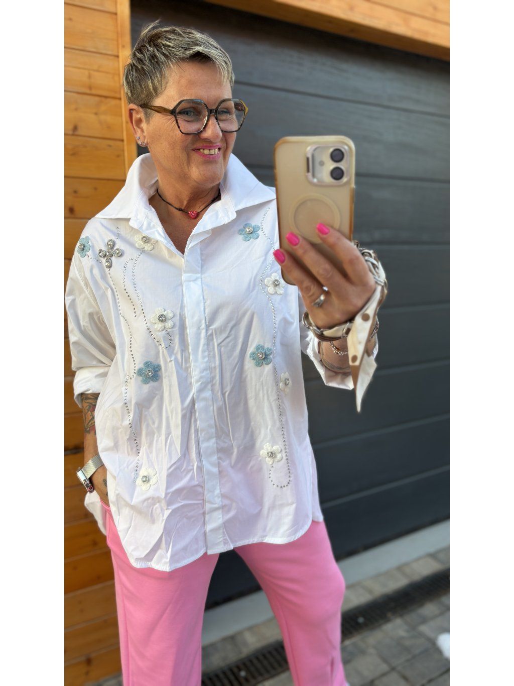 Na první pohled jednoduchá, na druhý naprosto kouzelná. Tato bavlněná košile zaujme ručně působícími květinovými aplikacemi doplněnými drobnými kamínky, které vytvářejí jemný, ale luxusní efekt.