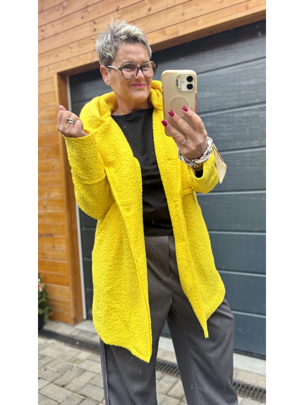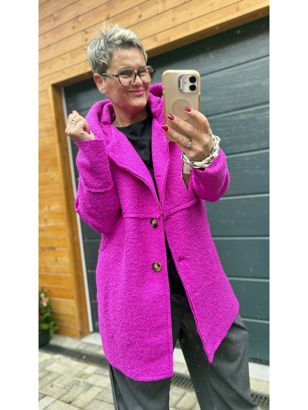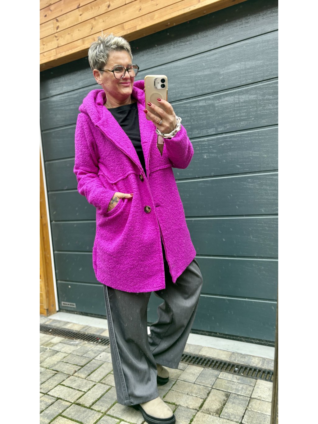 Tenhle kabátek je takové módní objetí. Materiál je krásně strukturovaný bouclé (jemně „chlupatý“), takže působí luxusně a zároveň mega příjemně na dotek. Volnější střih neřeší bříško ani boky – prostě oblékneš a jdeš.