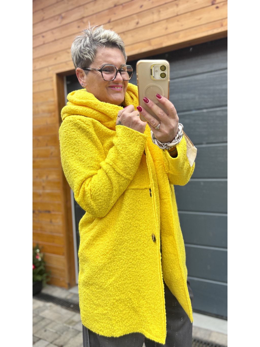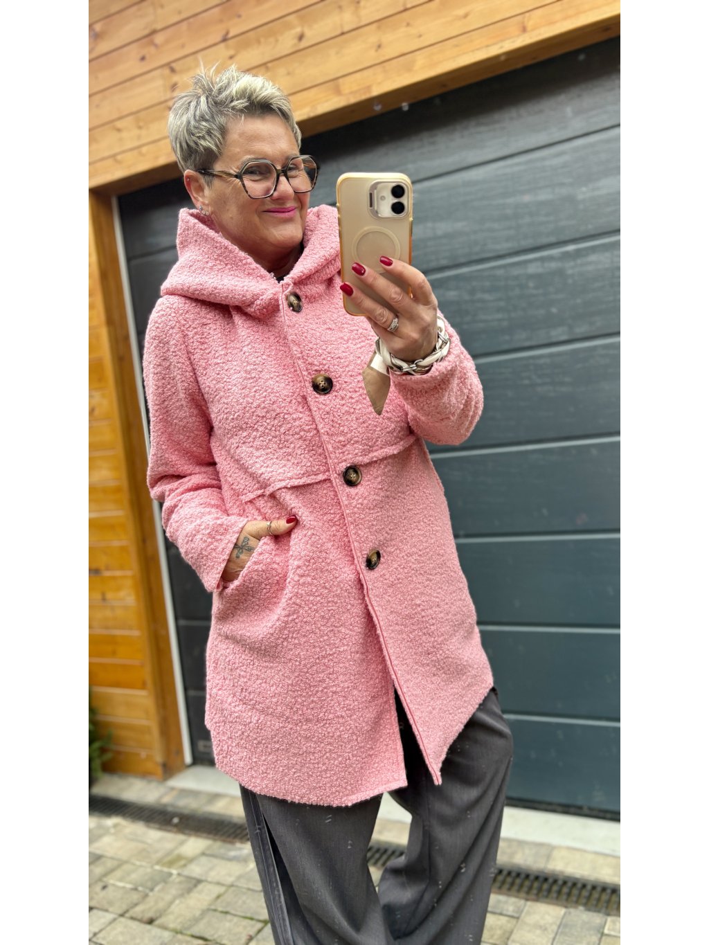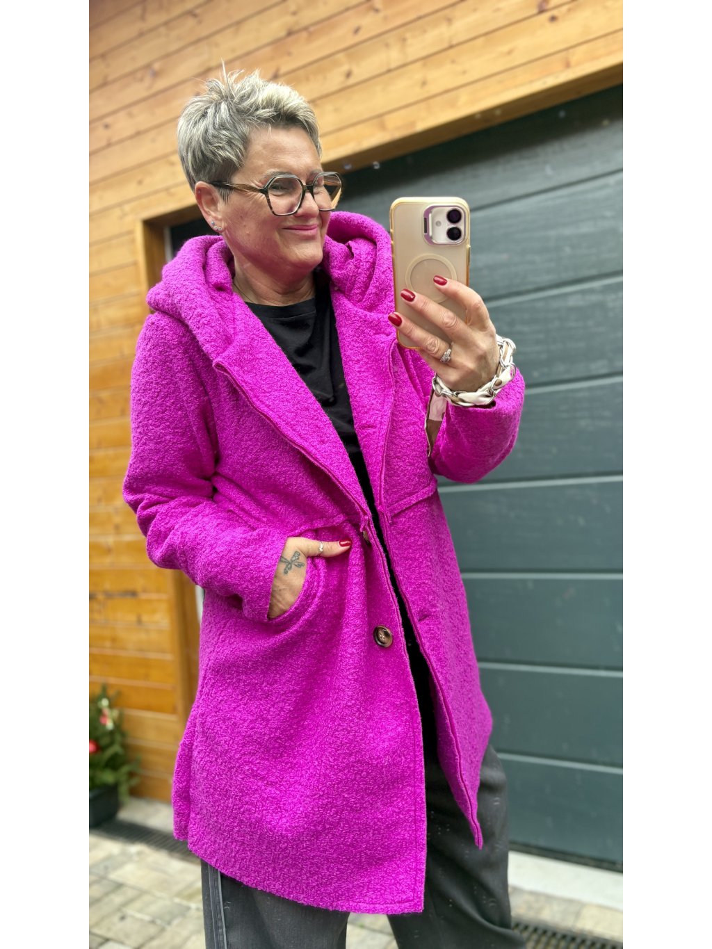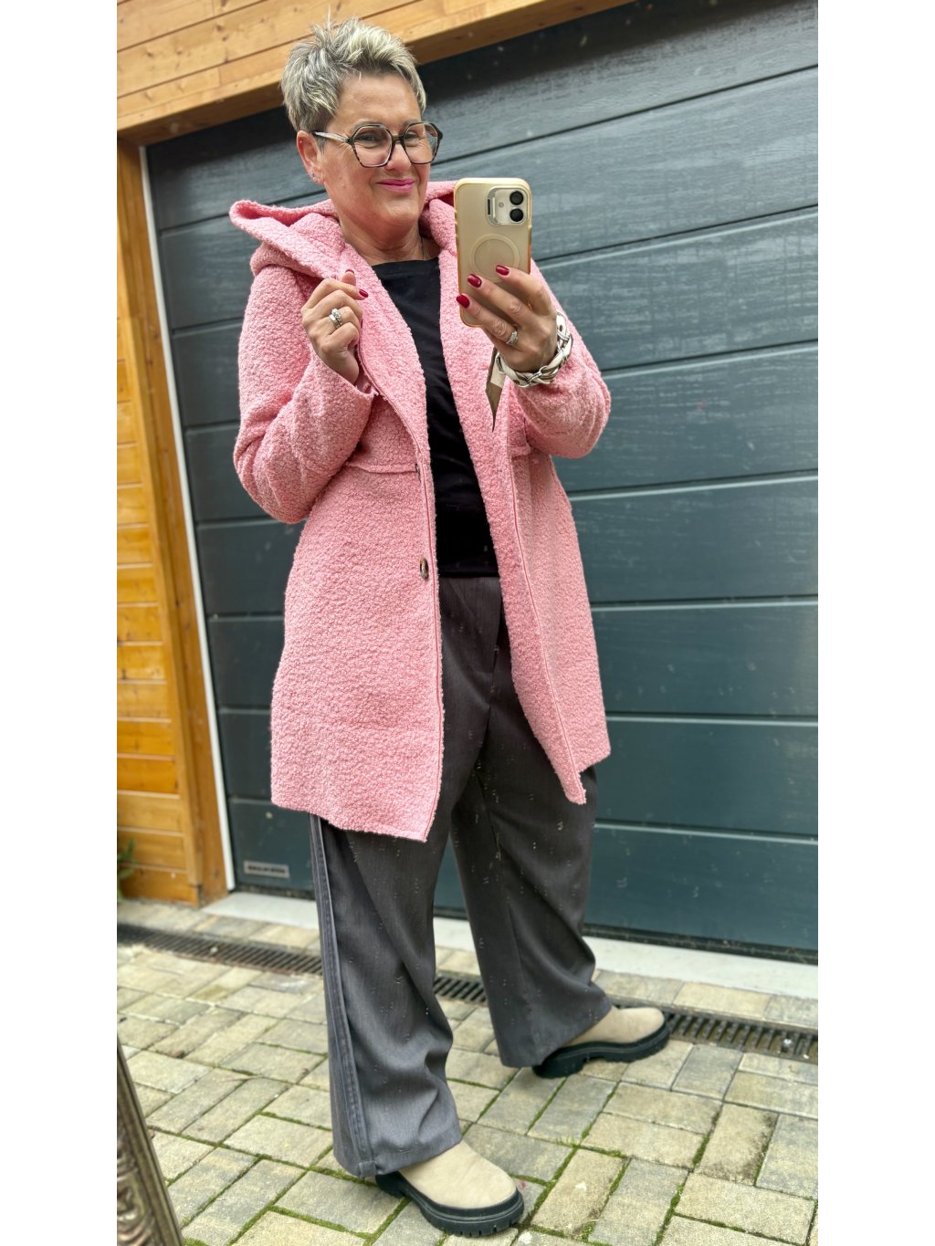 Tenhle kabátek je takové módní objetí. Materiál je krásně strukturovaný bouclé (jemně „chlupatý“), takže působí luxusně a zároveň mega příjemně na dotek. Volnější střih neřeší bříško ani boky – prostě oblékneš a jdeš.