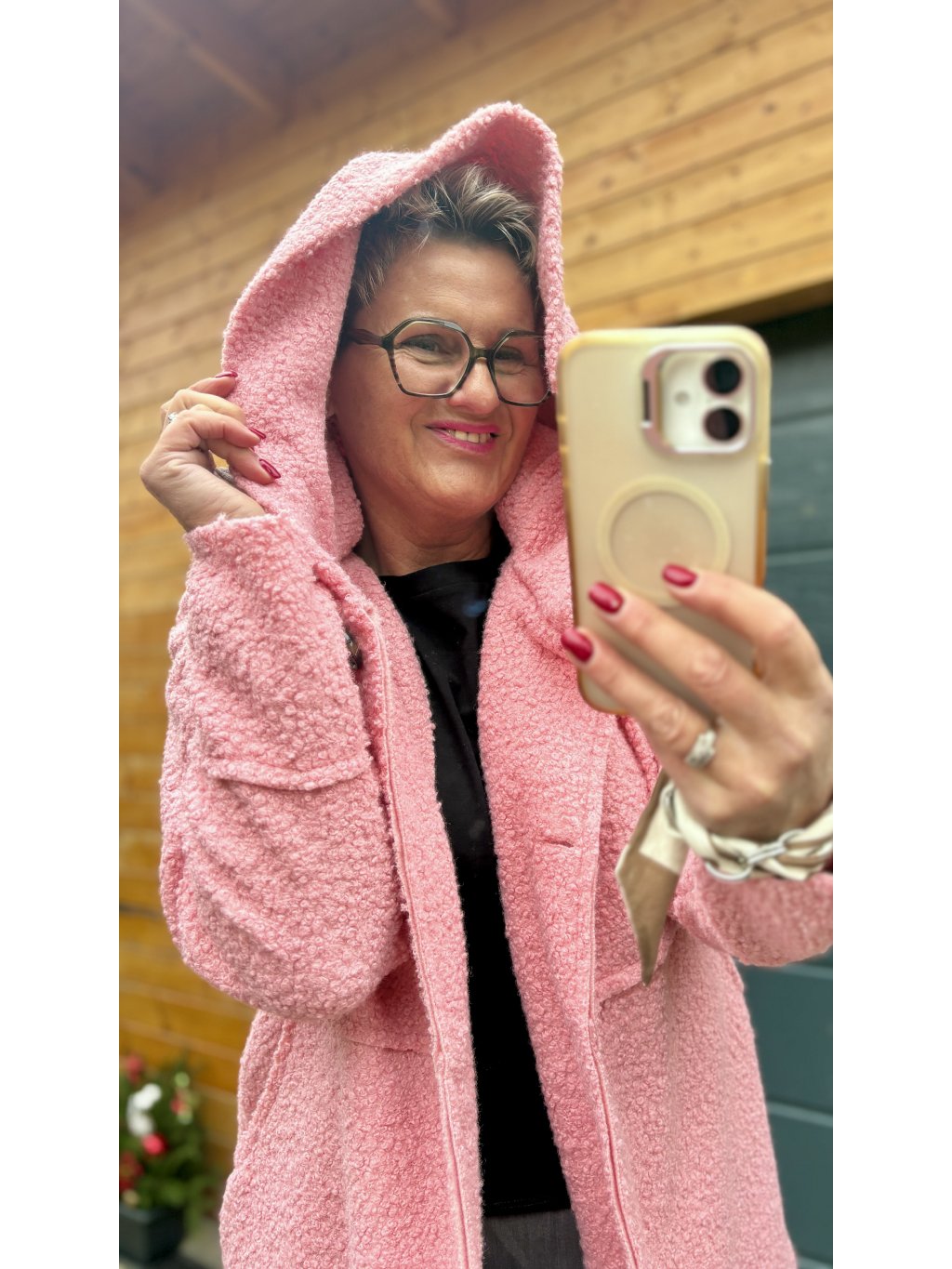 Bouclé kabátek s kapucí „Měkoučké objetí“