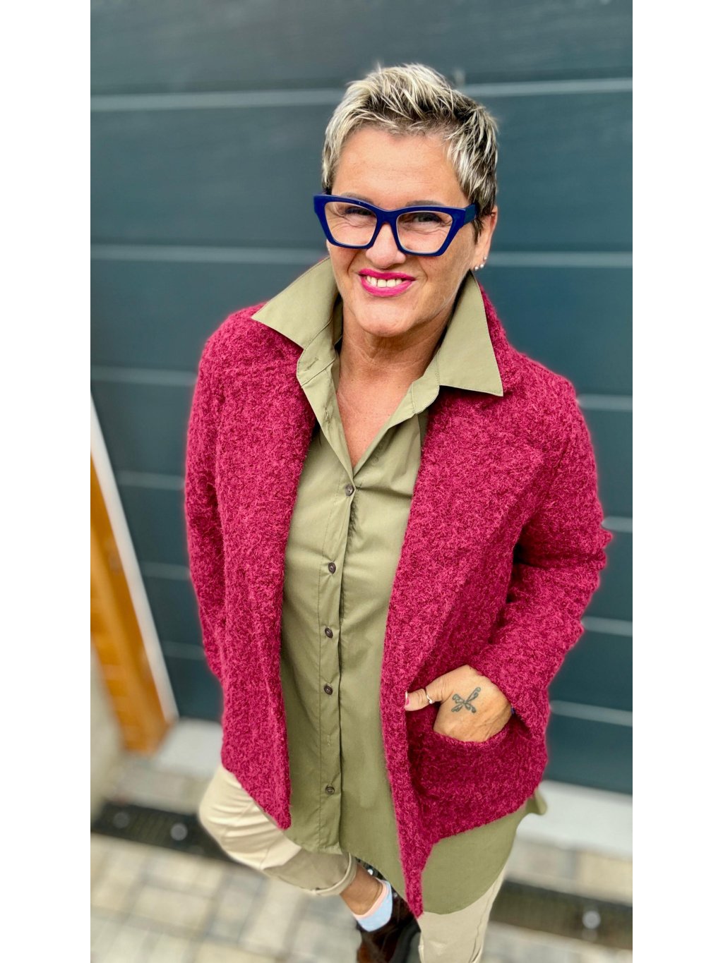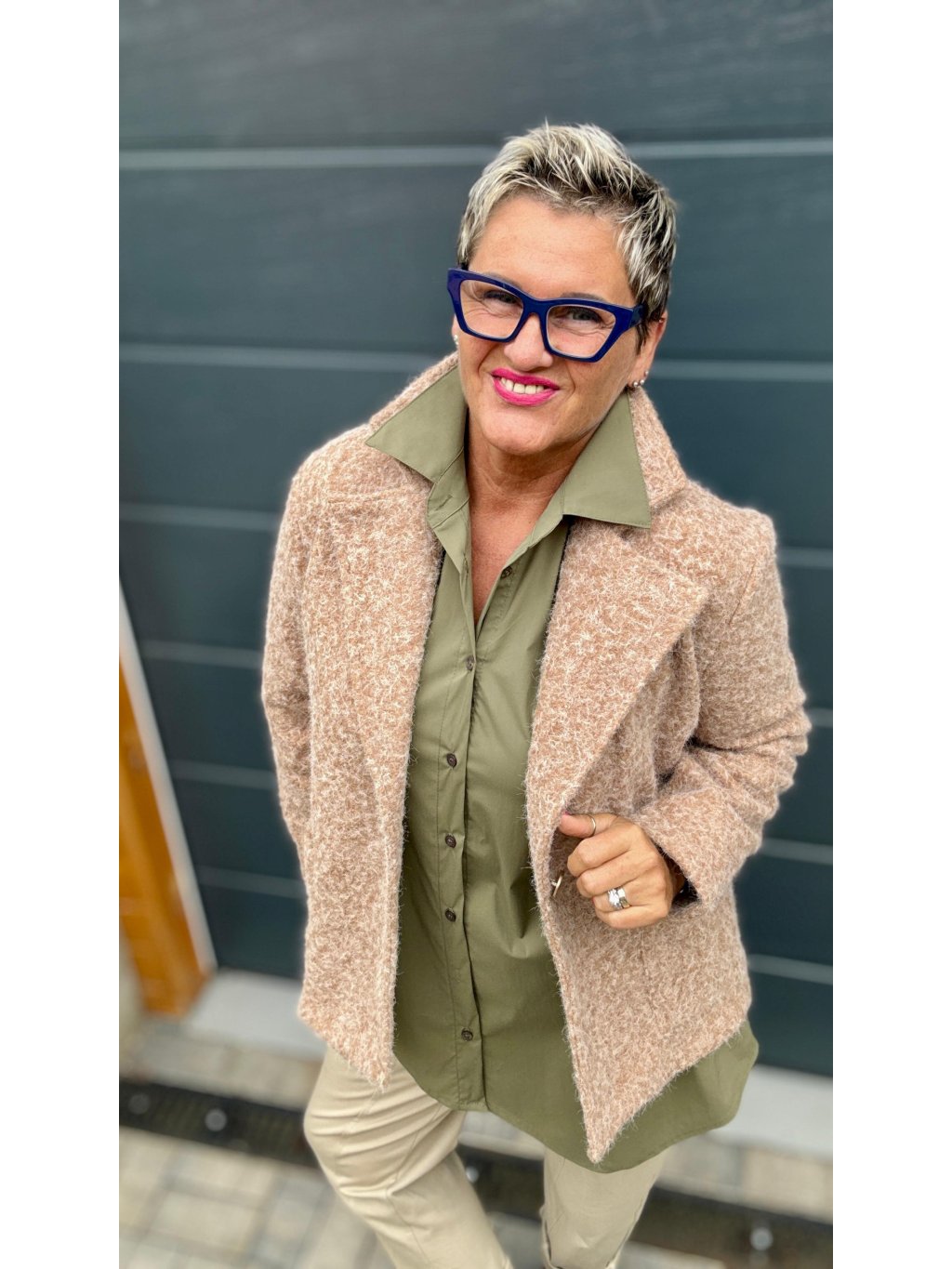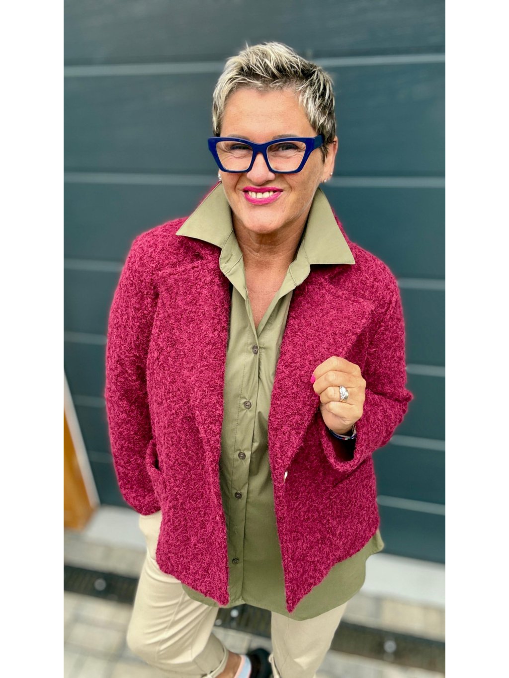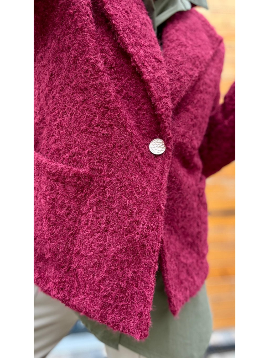 Stylový buklé kabátek, který díky ozdobnému knoflíku získává originální a elegantní vzhled. Ideální do práce, města i na volný čas.