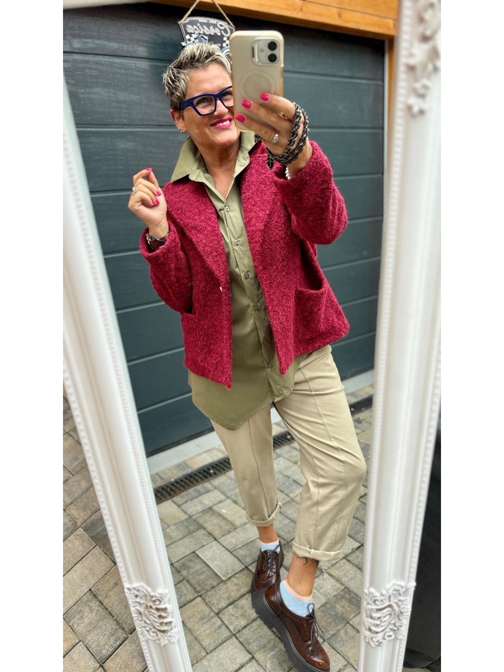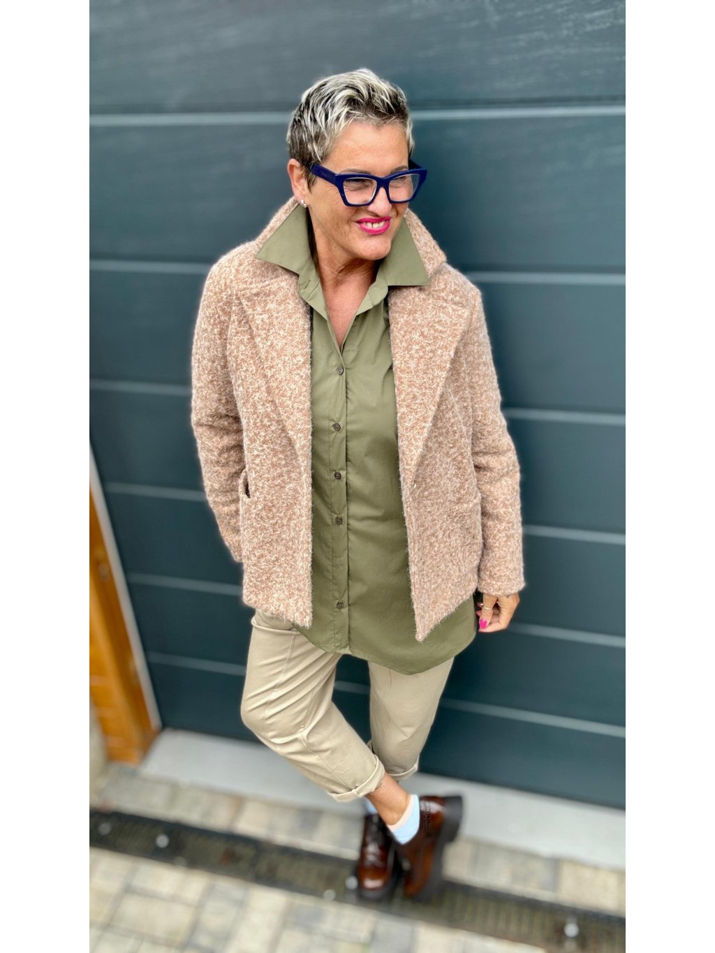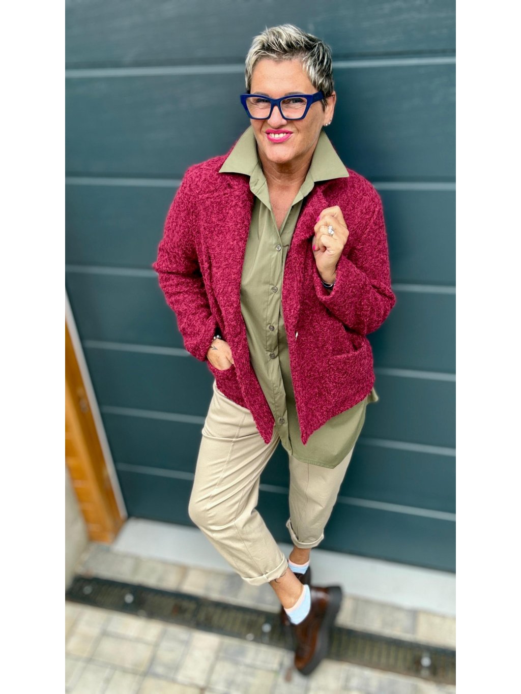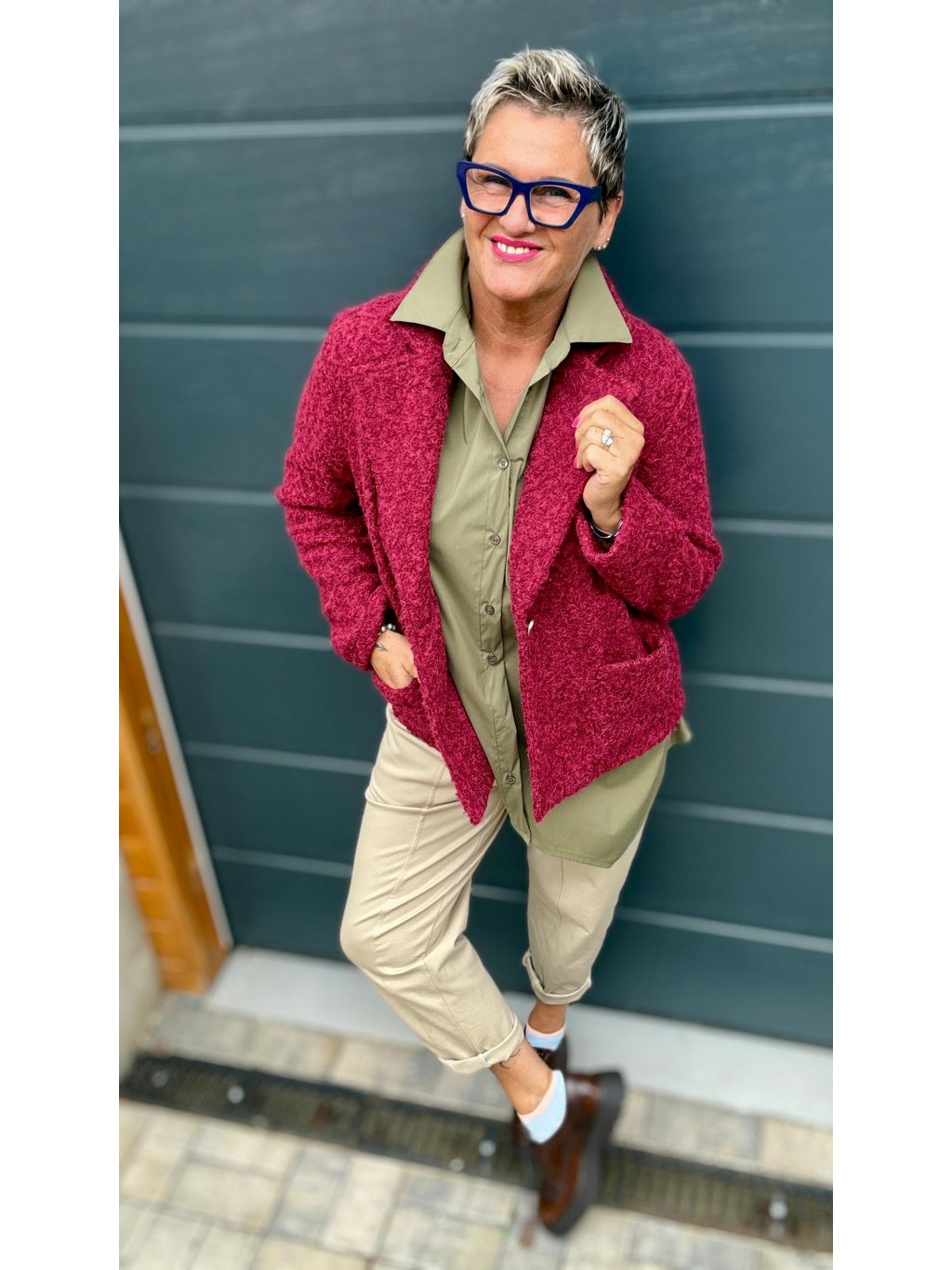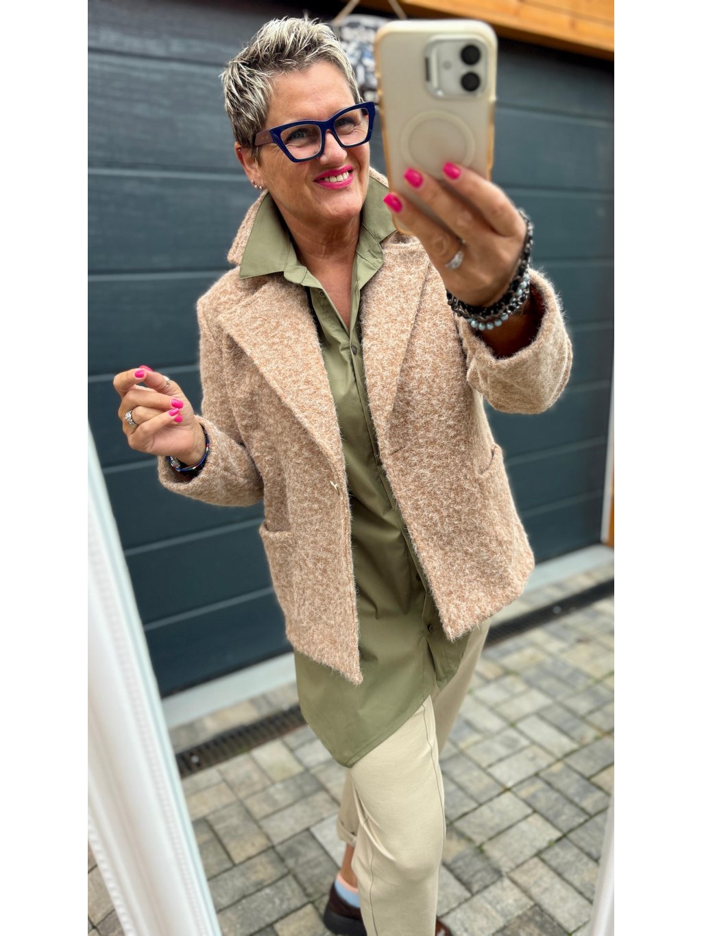 Stylový buklé kabátek, který díky ozdobnému knoflíku získává originální a elegantní vzhled. Ideální do práce, města i na volný čas.