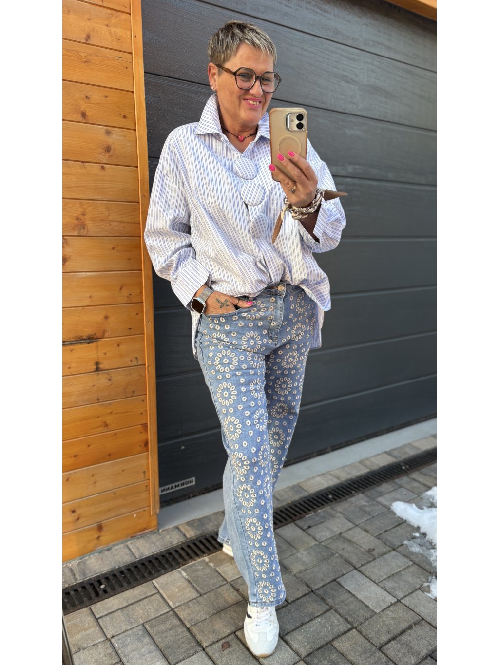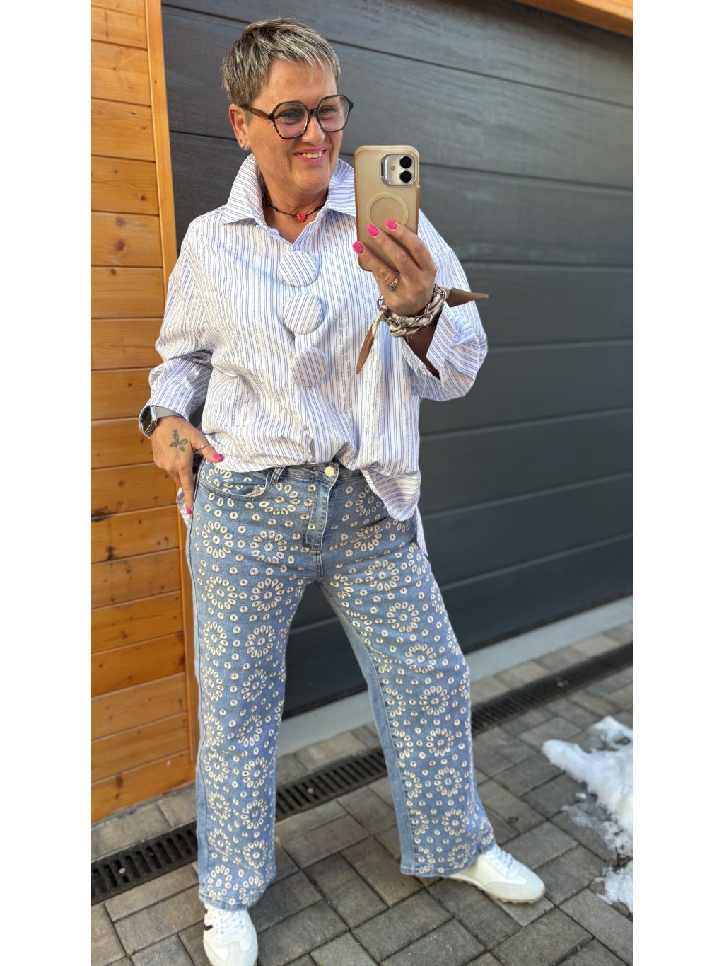 Stylové džíny, které zaujmou na první pohled originální výšivkou po celé délce nohavic. Díky pružnému materiálu jsou velmi pohodlné na nošení a přizpůsobí se postavě. Rovný až lehce rozšířený střih lichotí siluetě a opticky vyrovnává proporce. Skvělé pro každodenní nošení i jako výrazný kousek do města.