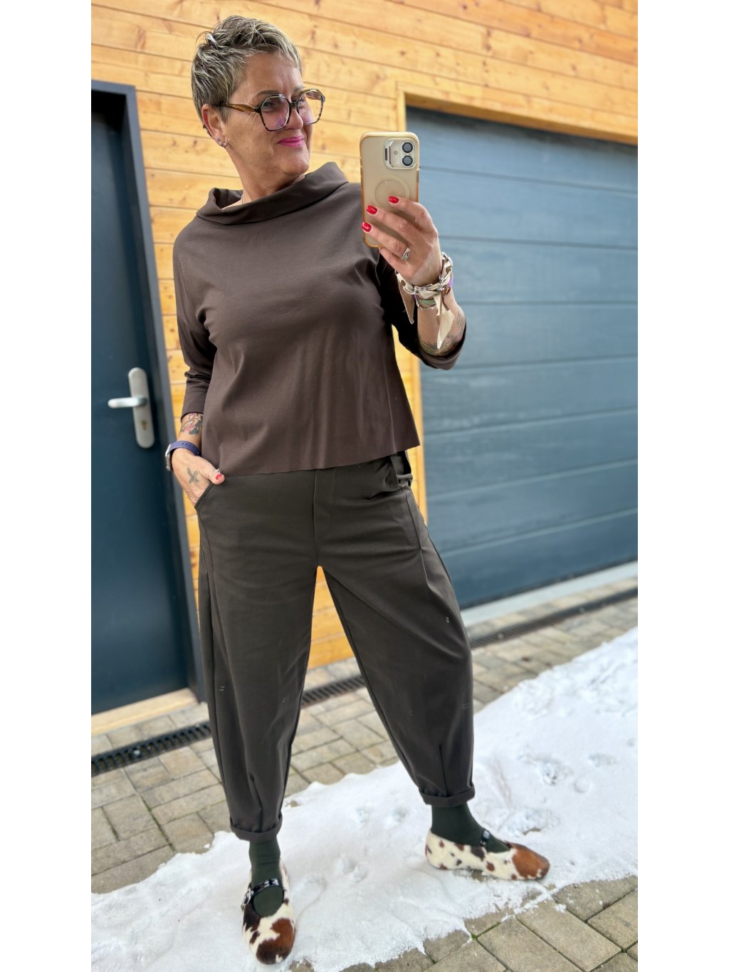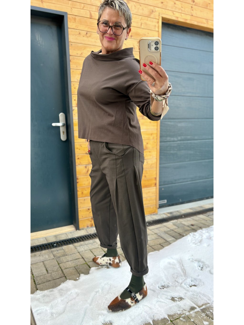 s kalhotami s vyšším pasem (rovné, balónové, elegantní)