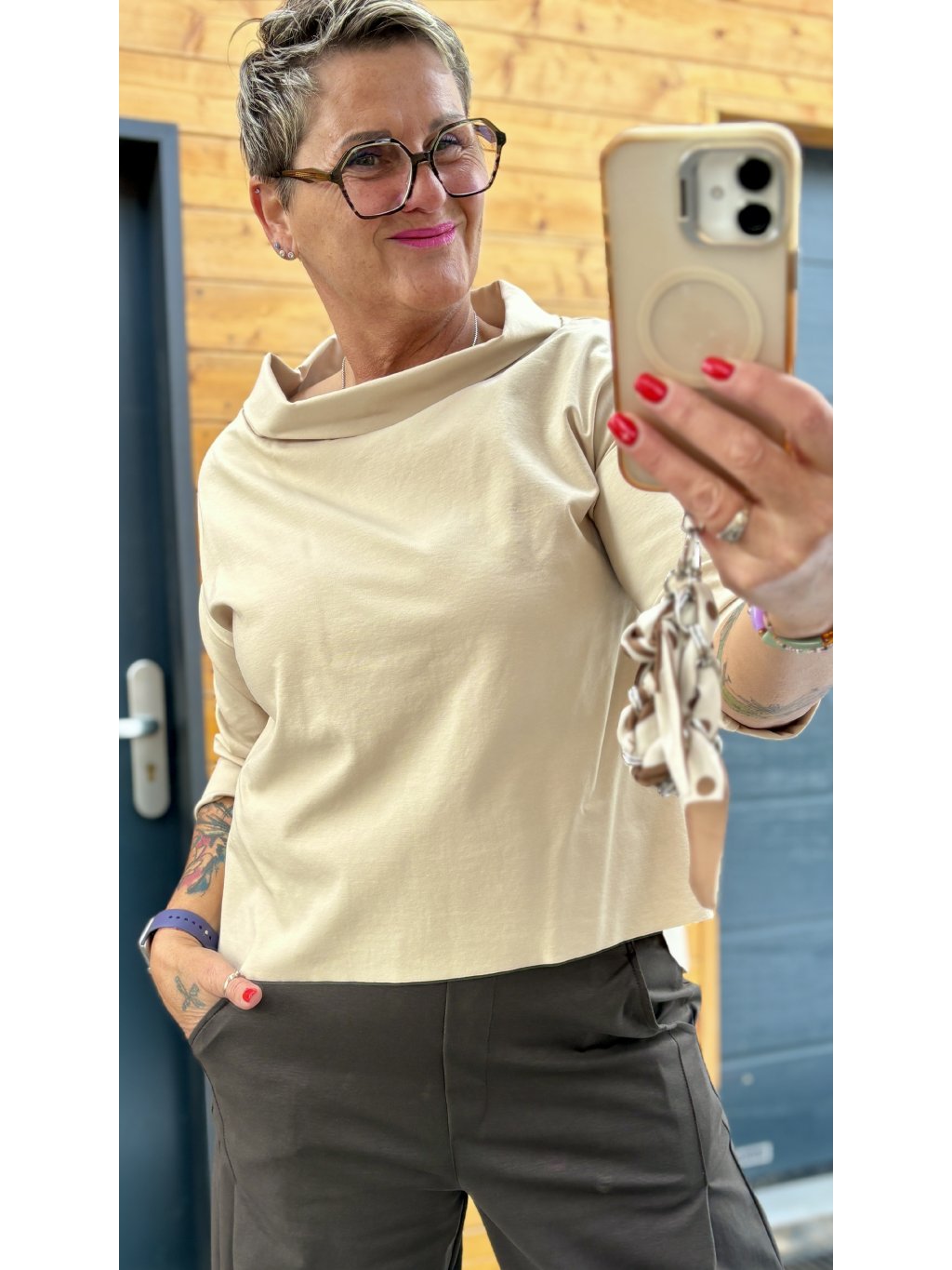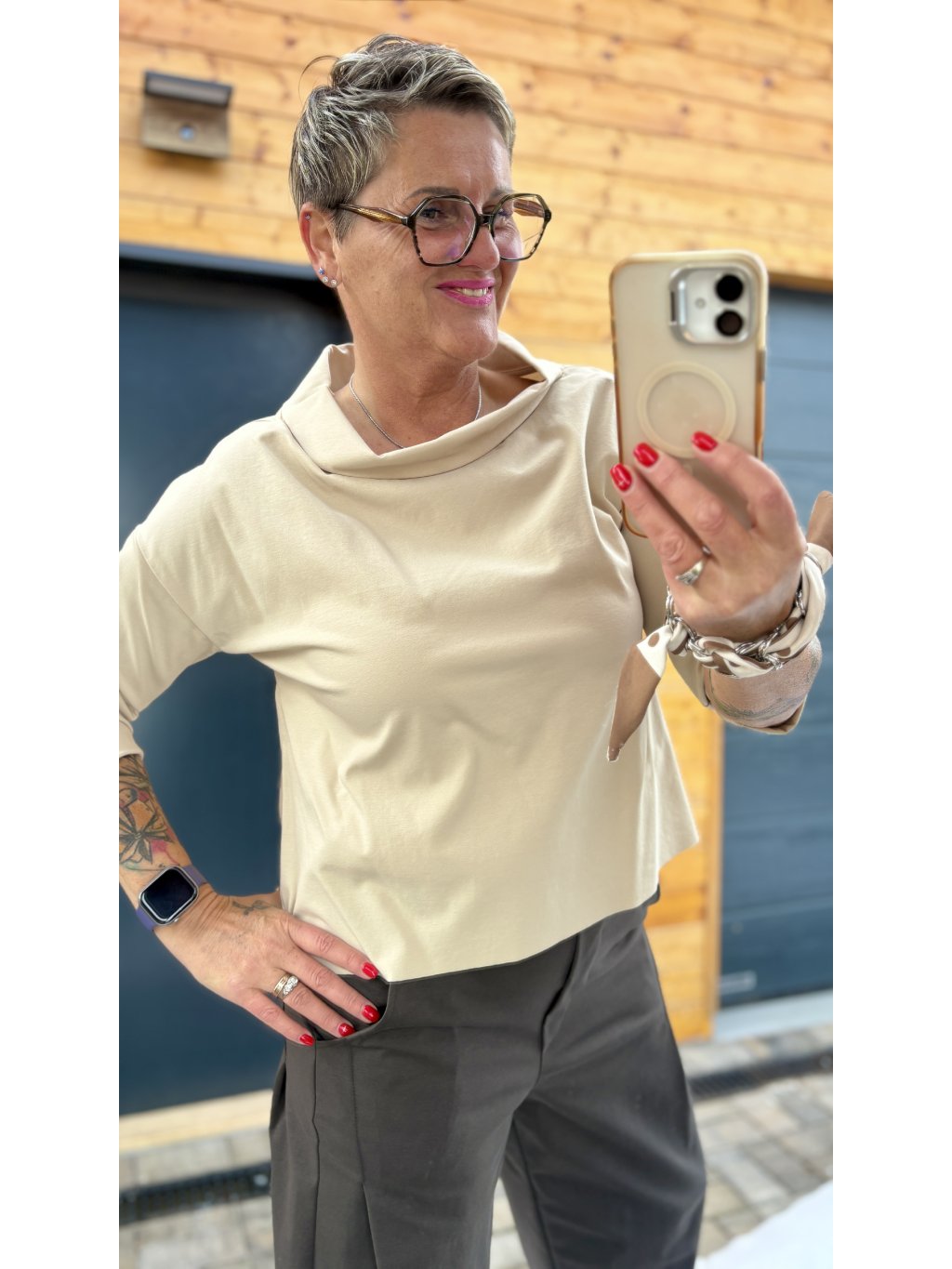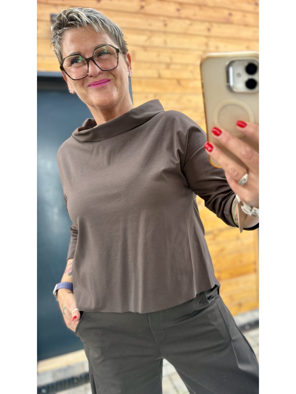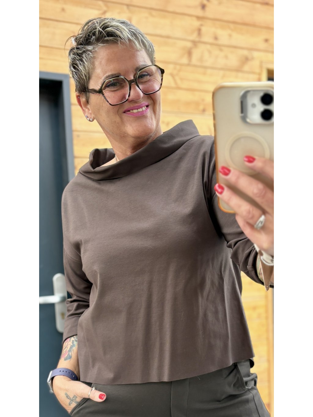 Pohodlné, pružné triko s elegantním lodičkovým límcem, kratším předním a delším zadním dílem. Krásně splývá, nelepí se a funguje jako dokonalý základ i samostatný kousek.