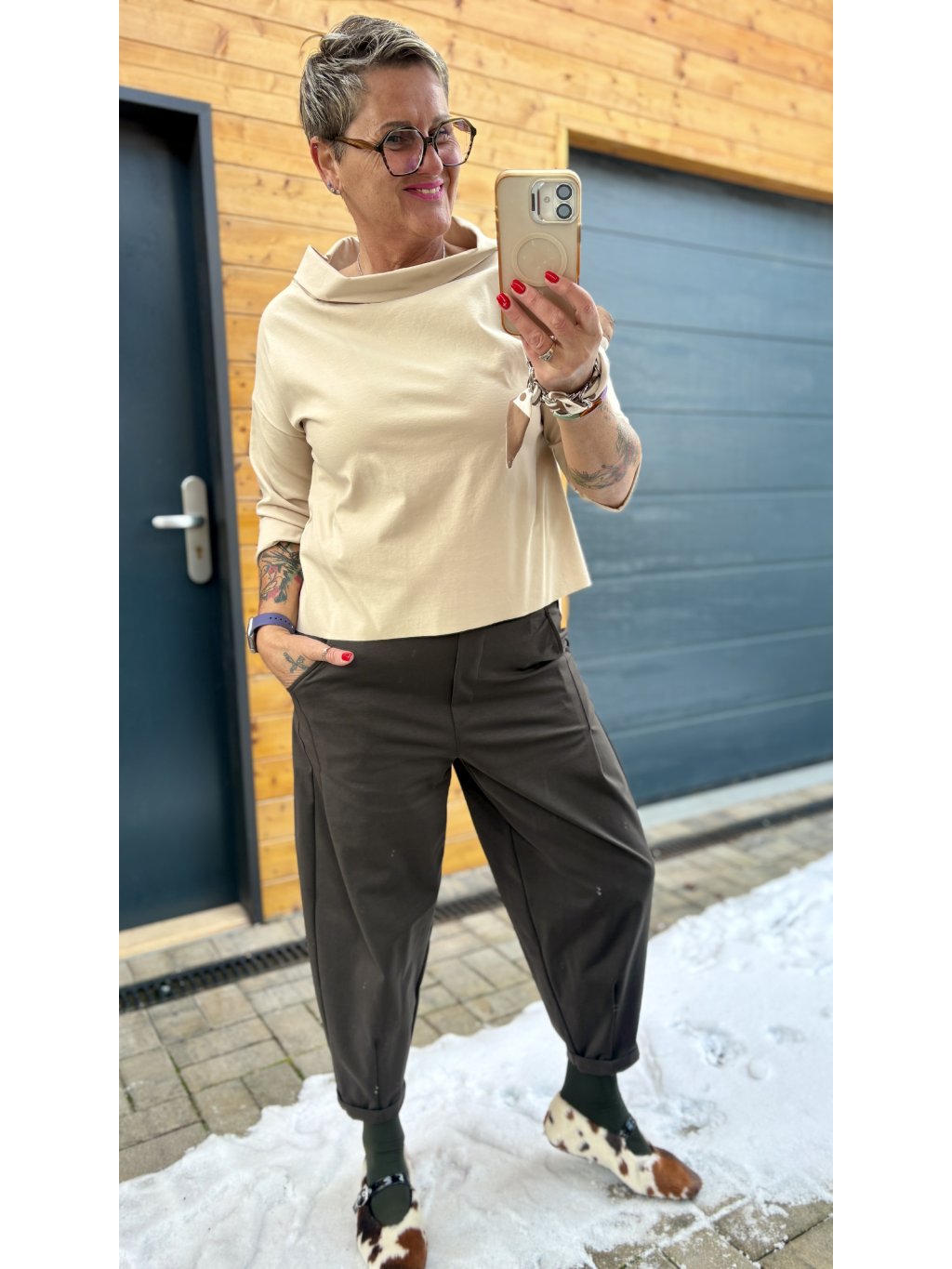 Kratší přední díl je ideální ke kalhotám s vyšším pasem, zatímco delší zadní část krásně zakryje záda a boky. Triko je pohodlné na celý den – od práce až po kávu s kamarádkou.