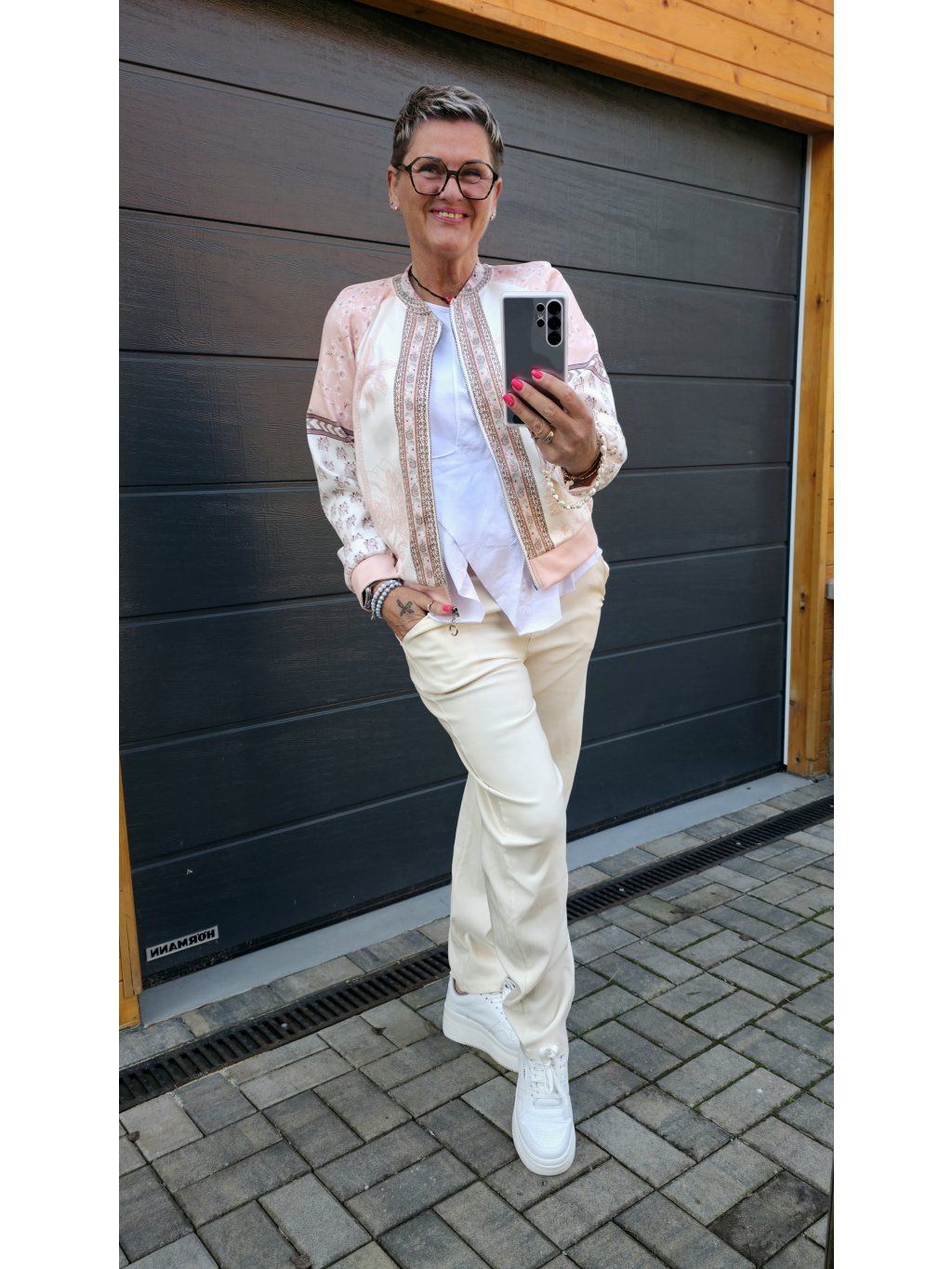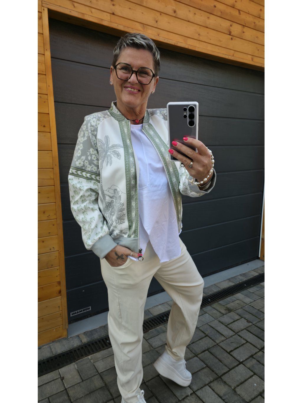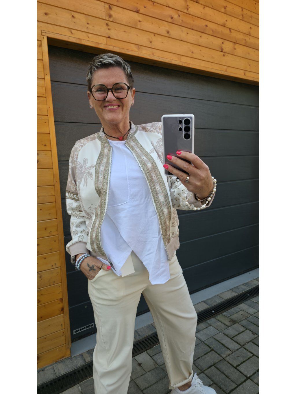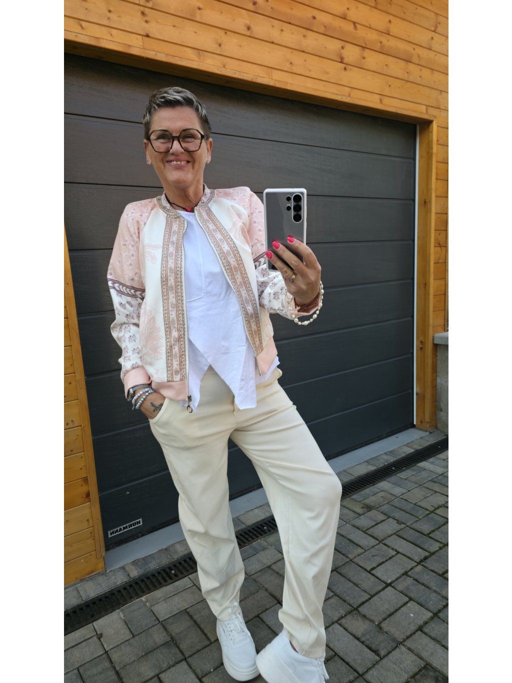 Elegantní bomberka, která v sobě spojuje sportovní pohodlí a ženský styl. Na první pohled zaujme jemným ornamentálním vzorem a strukturou materiálu, která připomíná broušenou kůži, přesto je lehká, pružná a velmi příjemná na nošení.