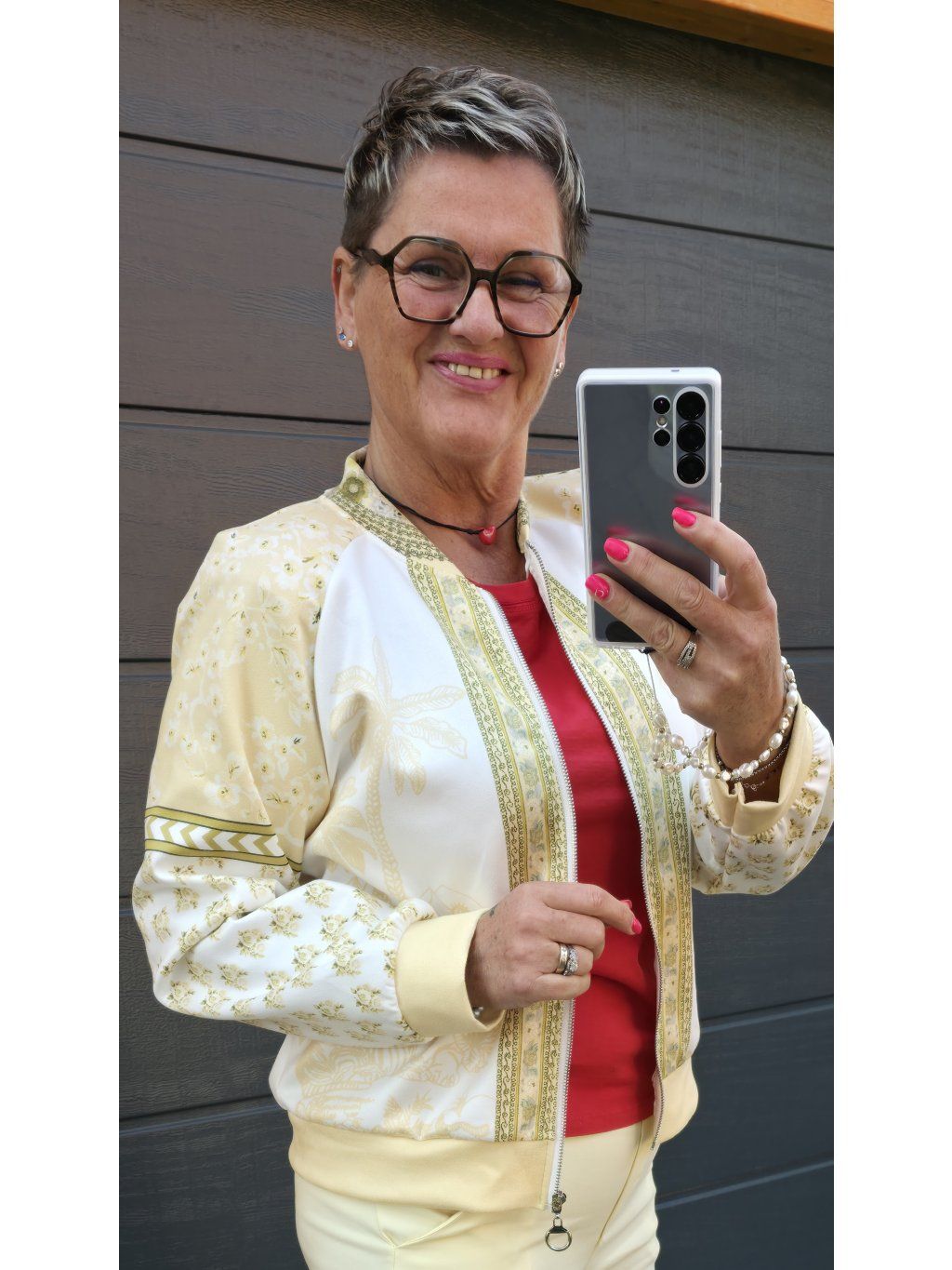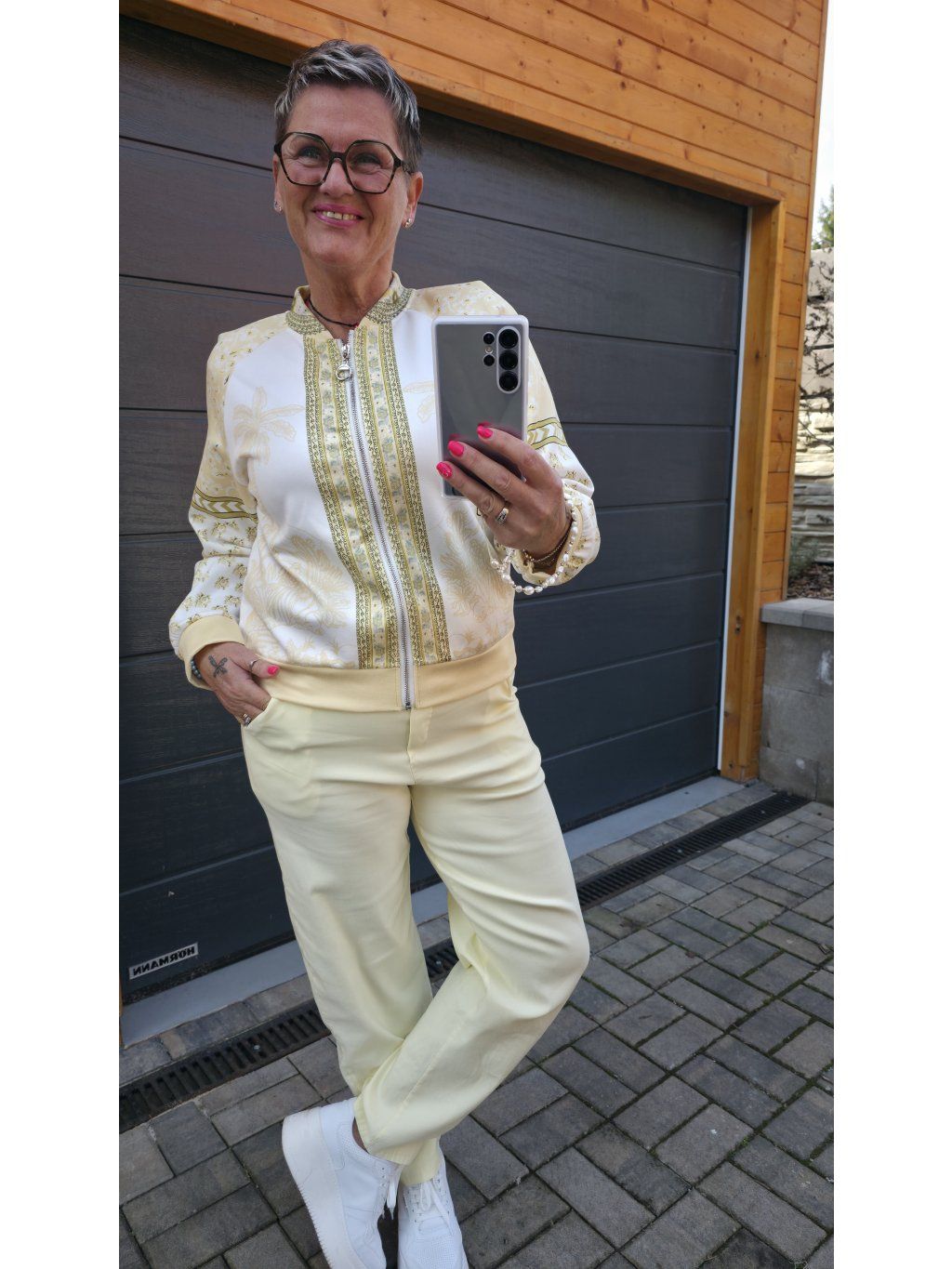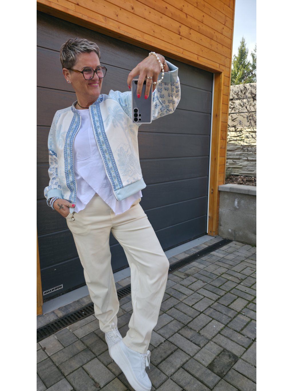 Elegantní bomberka, která v sobě spojuje sportovní pohodlí a ženský styl. Na první pohled zaujme jemným ornamentálním vzorem a strukturou materiálu, která připomíná broušenou kůži, přesto je lehká, pružná a velmi příjemná na nošení.