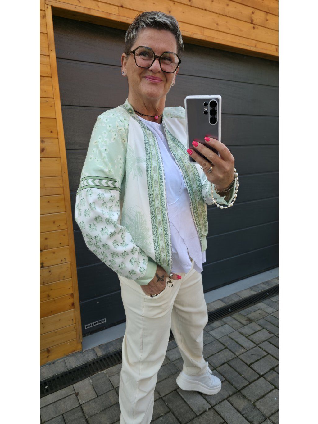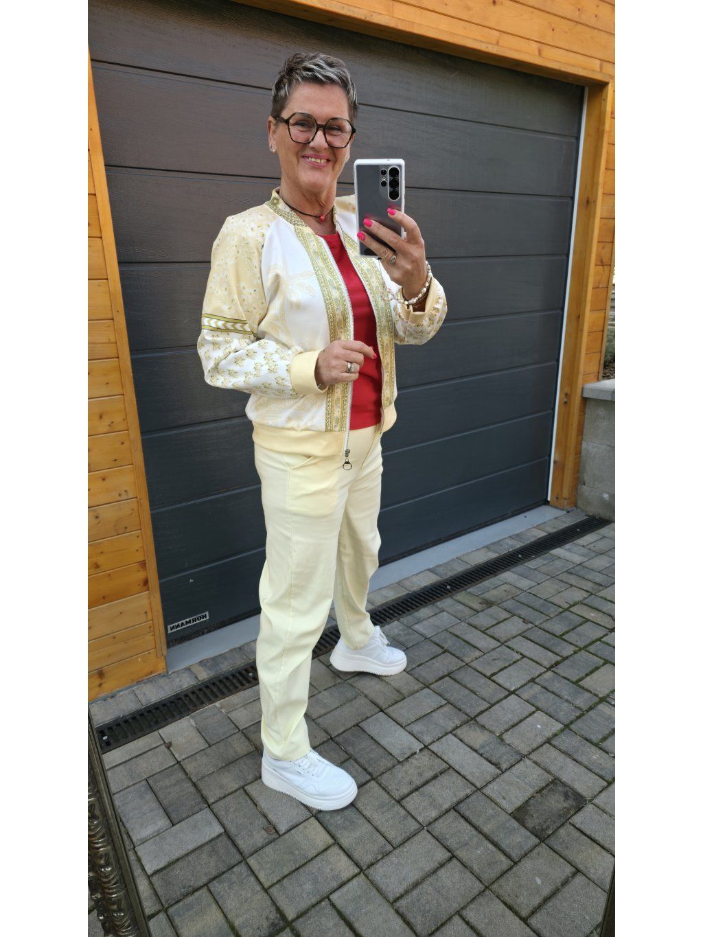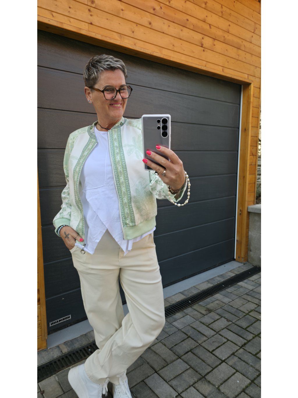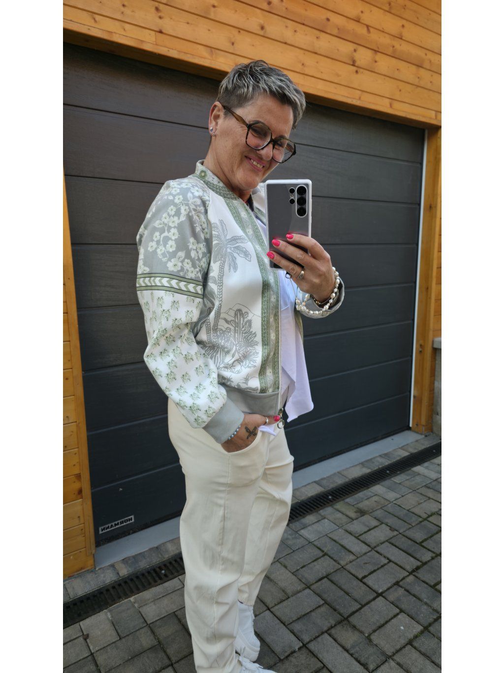 Elegantní bomberka, která v sobě spojuje sportovní pohodlí a ženský styl. Na první pohled zaujme jemným ornamentálním vzorem a strukturou materiálu, která připomíná broušenou kůži, přesto je lehká, pružná a velmi příjemná na nošení.