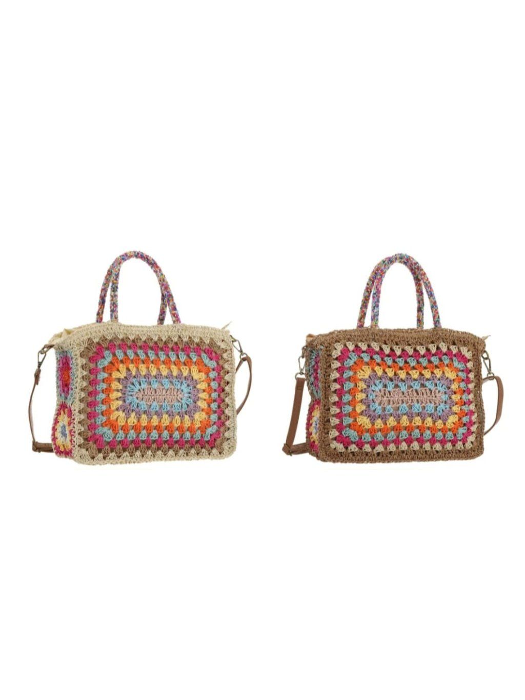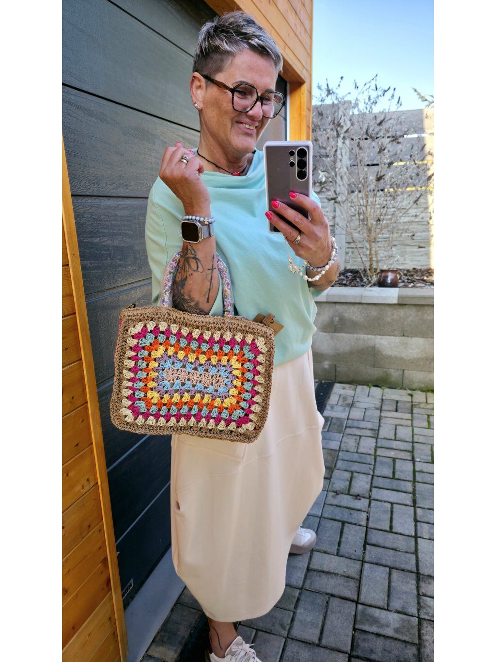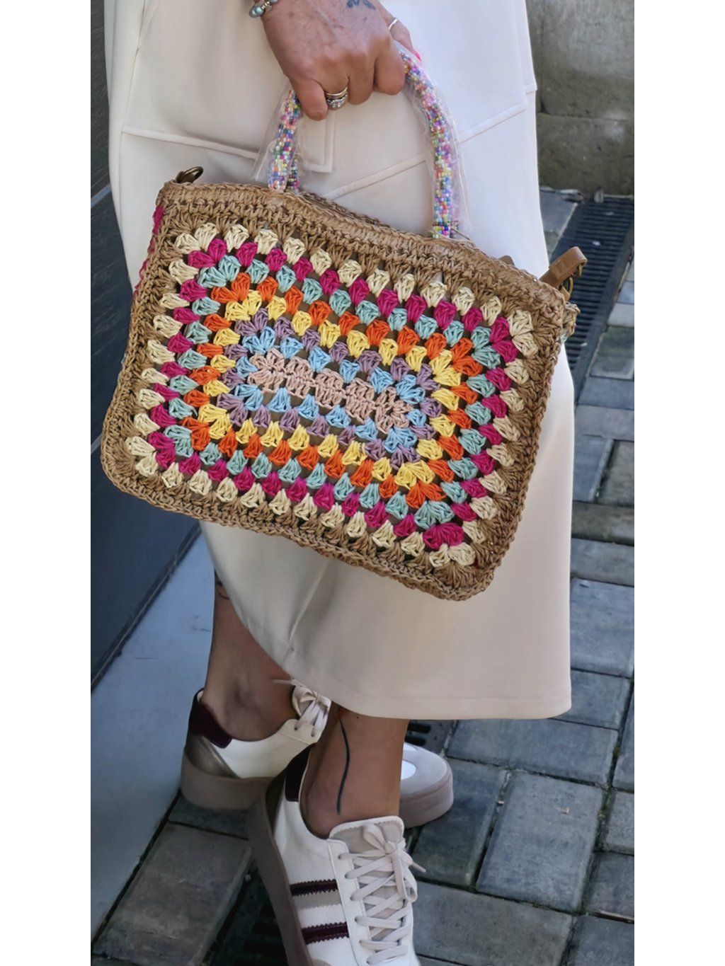 Tahle kabelka je čistá radost a léto v jednom doplňku. Přírodní základ doplňuje barevný háčkovaný vzor, který působí hravě, svěže a originálně.