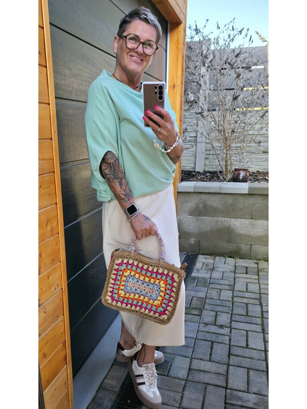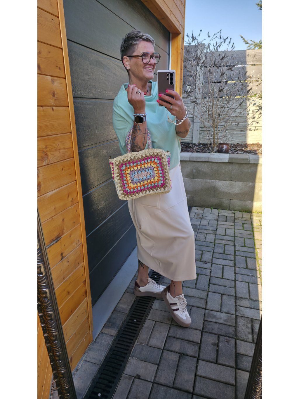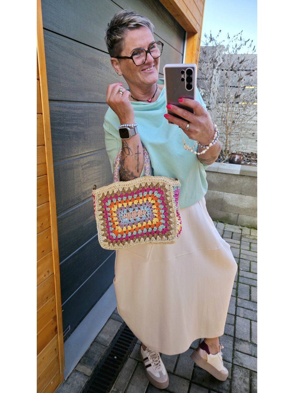 Tahle kabelka je čistá radost a léto v jednom doplňku. Přírodní základ doplňuje barevný háčkovaný vzor, který působí hravě, svěže a originálně.
