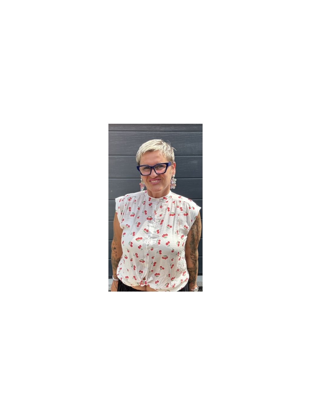 Romantická, ale s kapkou retro hravosti – tato halenka s potiskem třešní je jako stvořená pro léto. Lehoučká, vzdušná, s drobnými knoflíčky vpředu a jemně nařaseným stojáčkem bez rukávů. Skvěle padne jak ke kraťasům, tak k sukním nebo kalhotám – a rozhodně přitáhne pohledy 🍒