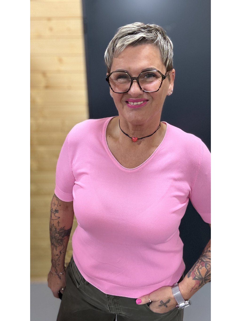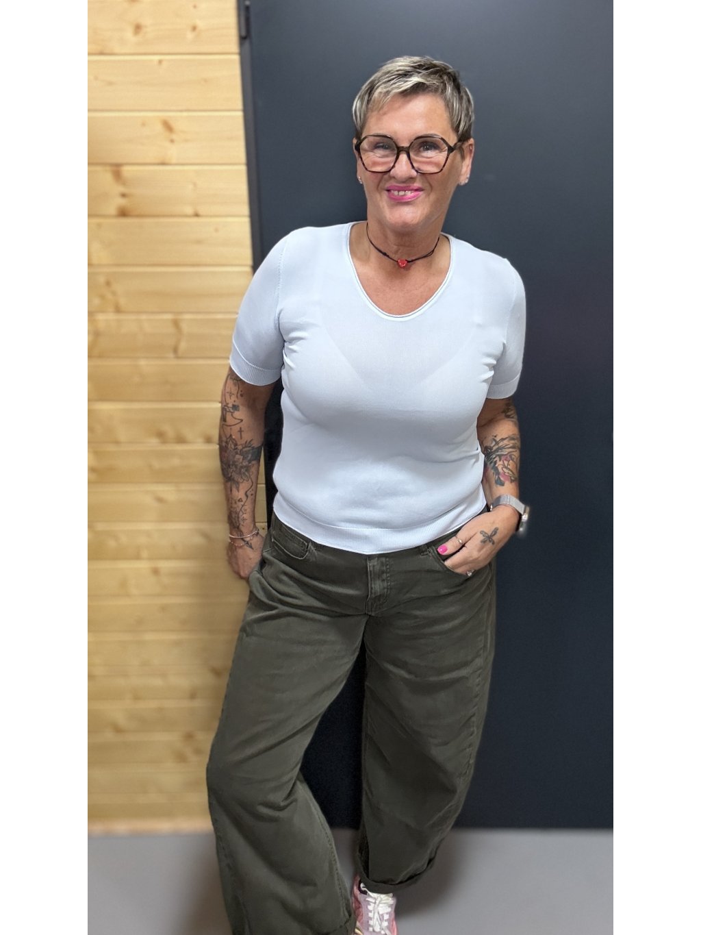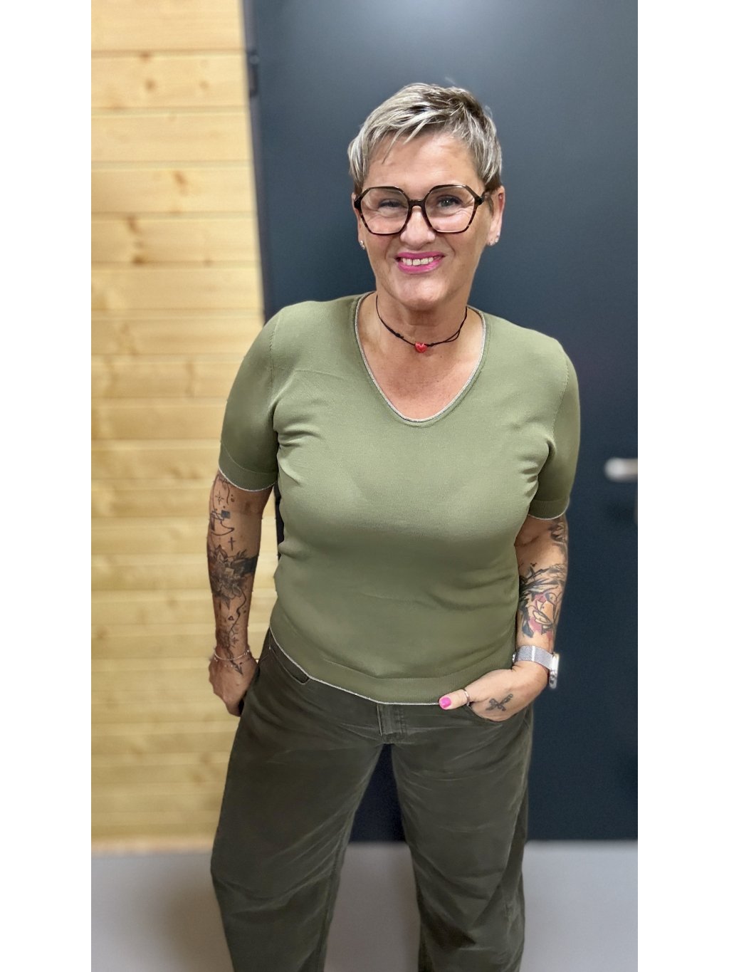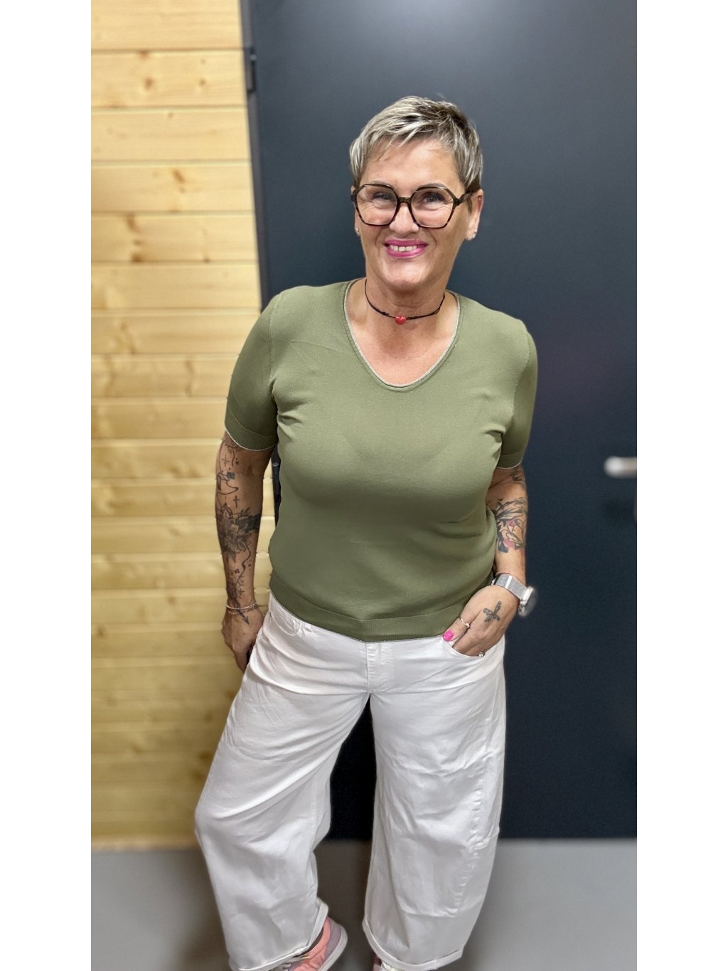 Elegantní a zároveň pohodlné triko s krátkým rukávem, výstřihem do V a jemným stříbrným lemováním, které dodává outfitu nenápadný šmrnc. Ideální základ pro každodenní nošení i elegantnější kombinace.