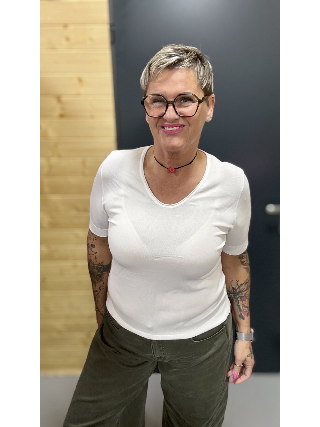 Příjemný, pružný materiál se krásně přizpůsobí postavě, netlačí a drží tvar i během celého dne. Triko je ideální jak samostatně, tak jako spodní vrstva pod saka, kardigany nebo vesty.