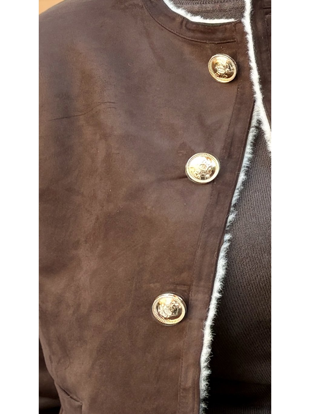 Krátký hnědý kabátek s krémovým kožíškem a zlatými knoflíky. Hebký, hřejivý, pružný a udělá krásnou siluetu bez zbytečného objemu.
