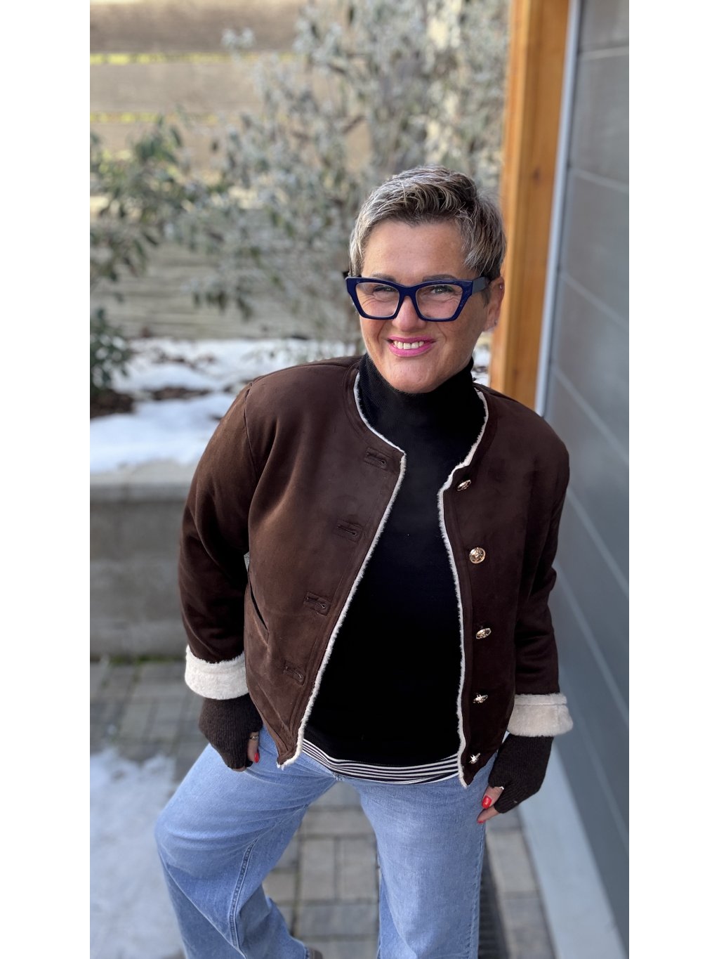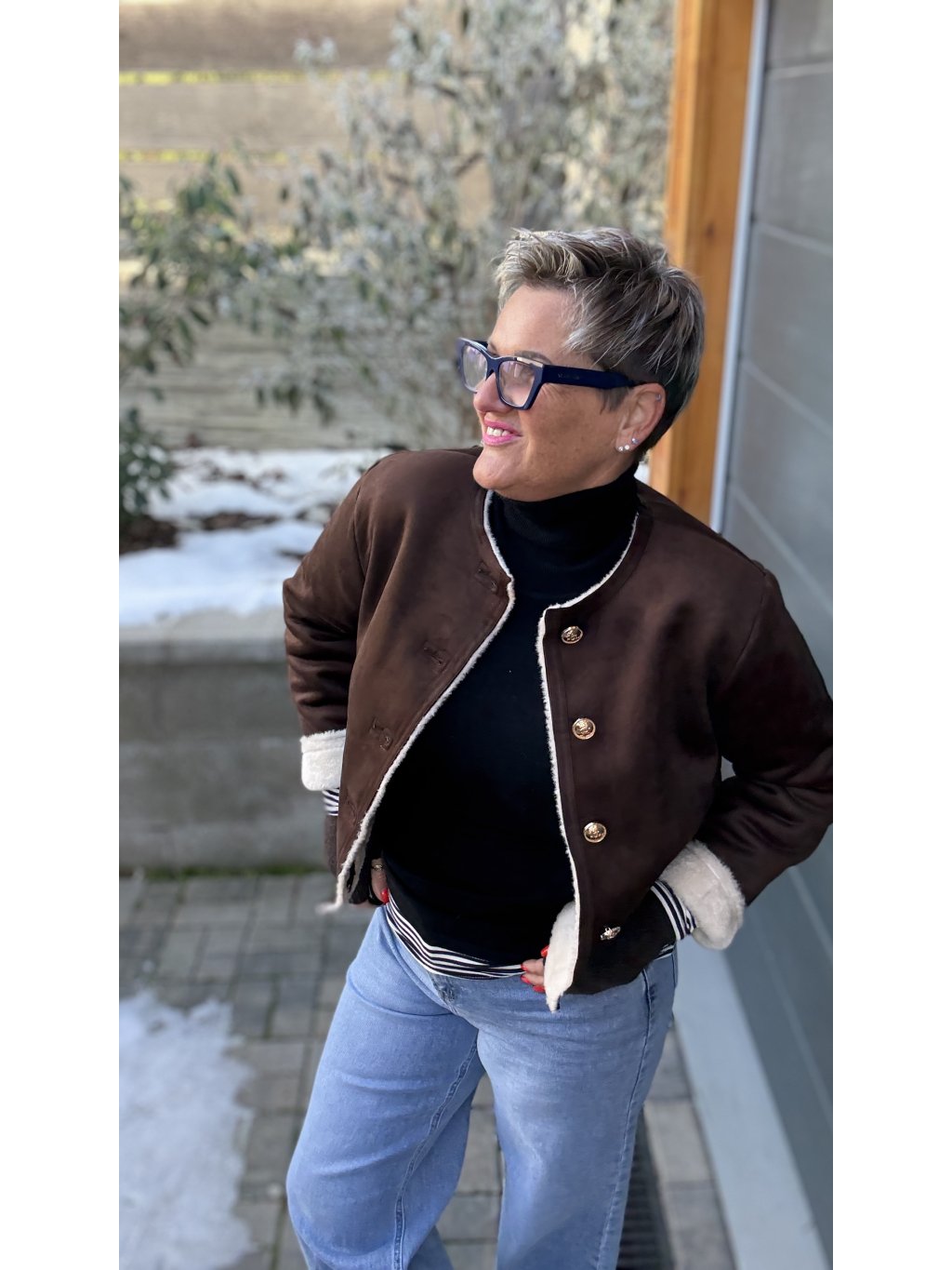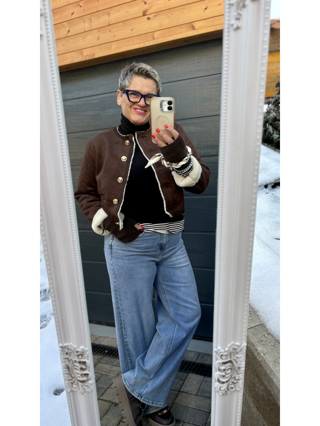 Krátký, heboučký kabátek v čokoládově hnědém tónu s krémovým kožíškem uvnitř. Zahřeje, obejme a ještě udělá wau efekt díky zlatým knoflíkům. Ideální na vrstvení a rychlé “hodím a jdu”.