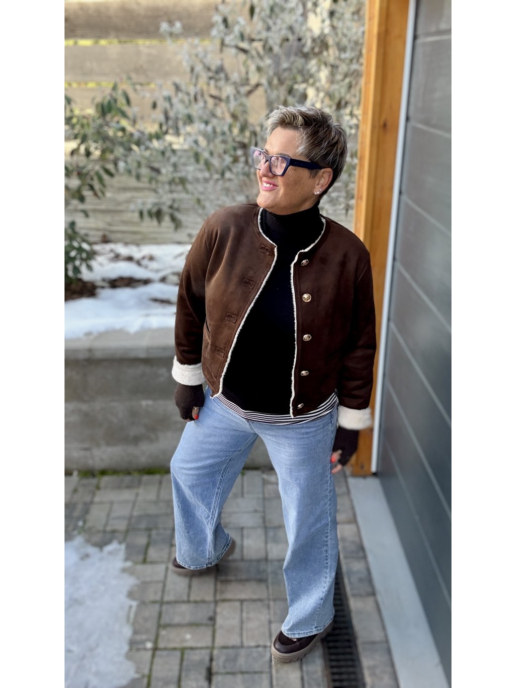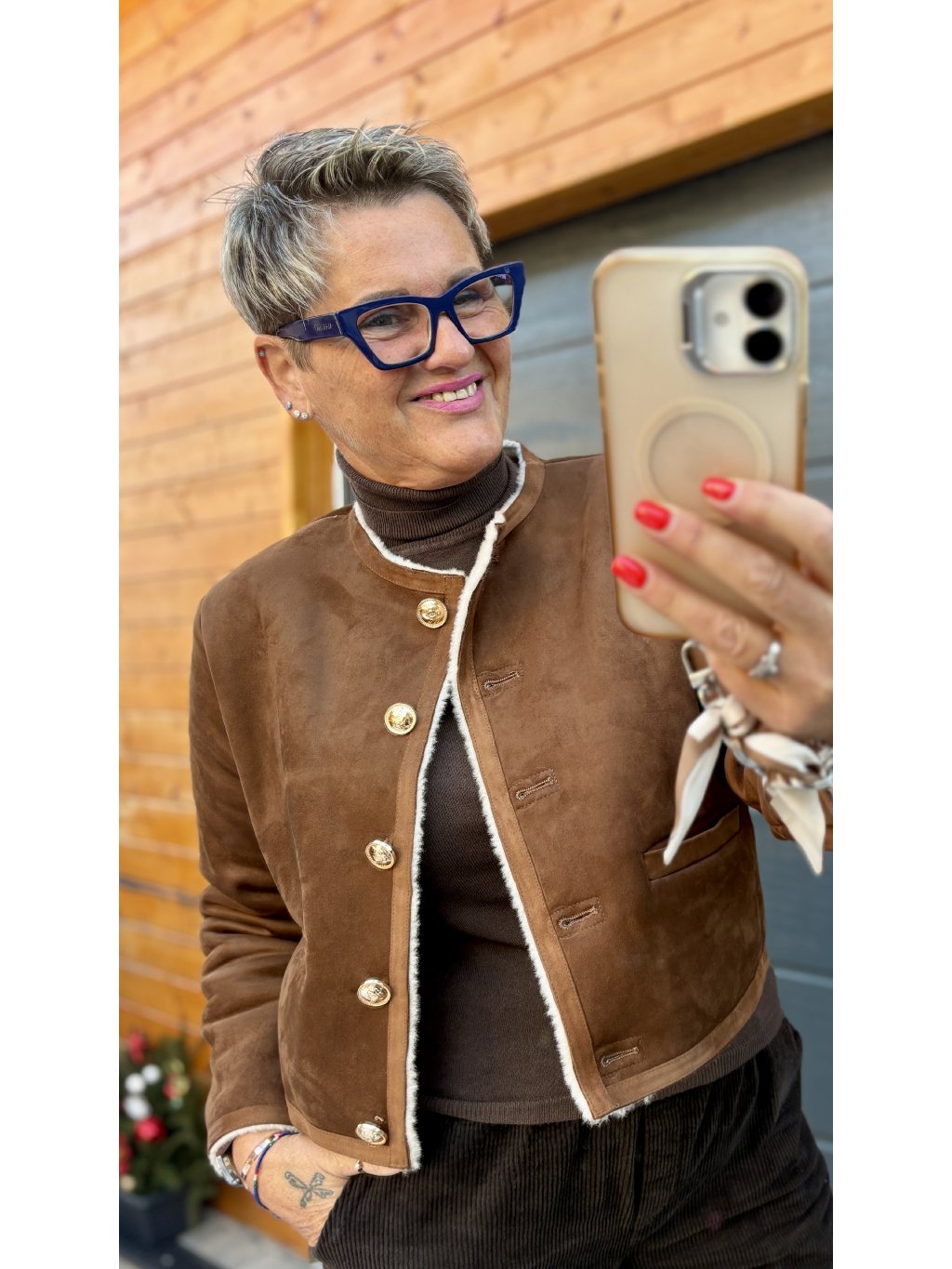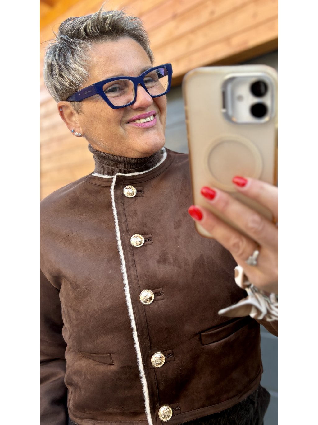 Krátký, heboučký kabátek v čokoládově hnědém tónu s krémovým kožíškem uvnitř. Zahřeje, obejme a ještě udělá wau efekt díky zlatým knoflíkům. Ideální na vrstvení a rychlé “hodím a jdu”.