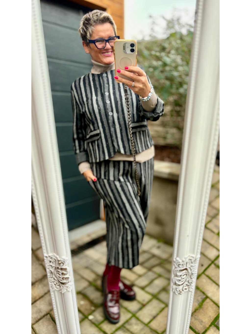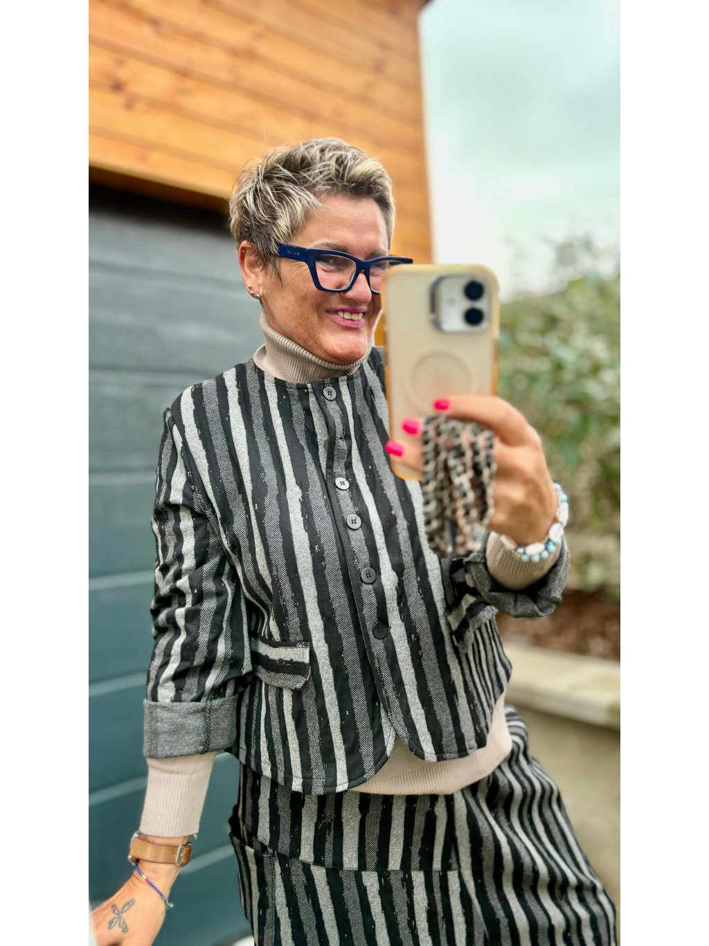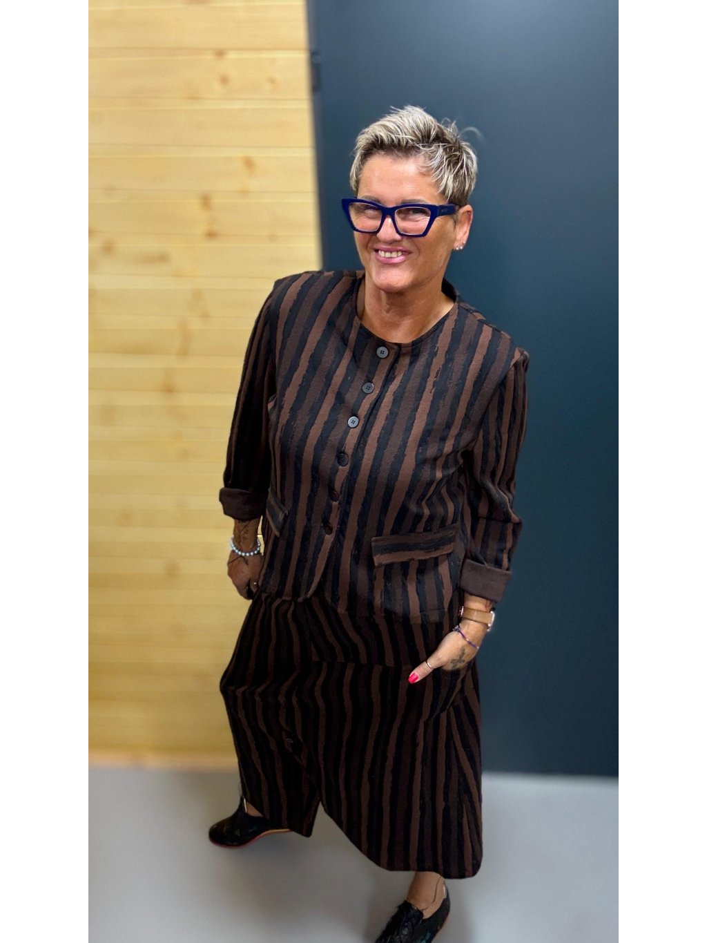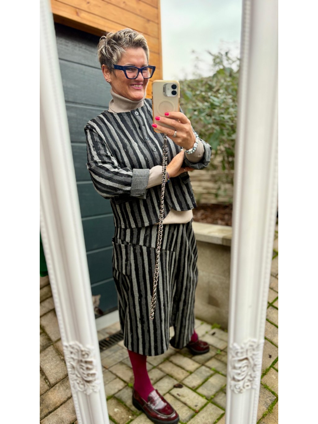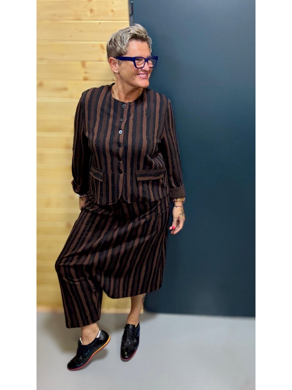 Materiál je stejný jako u kalhotové sukně → společně tvoří ikonický komplet, ale každý kousek můžeš nosit i zvlášť.