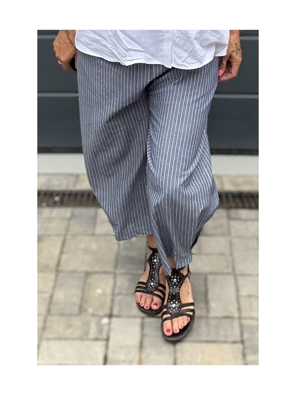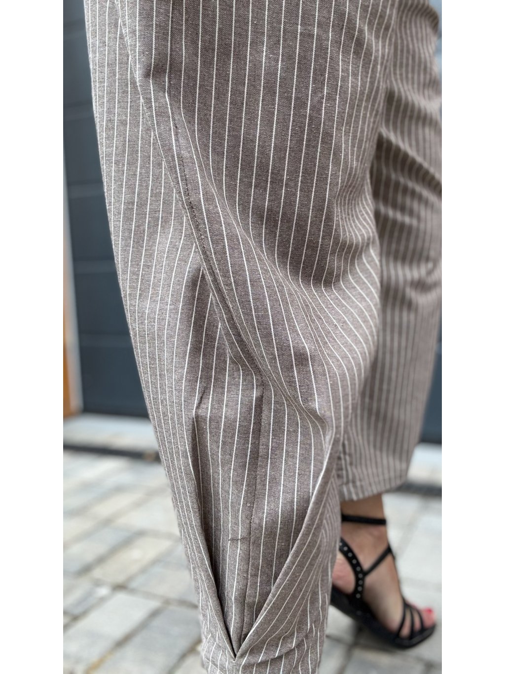 Letní kalhoty s jemným proužkem a efektním skladem na nohavici – pohodlné, vzdušné a stylové.