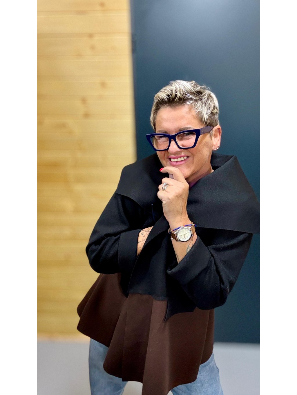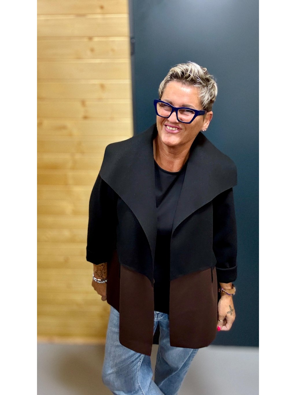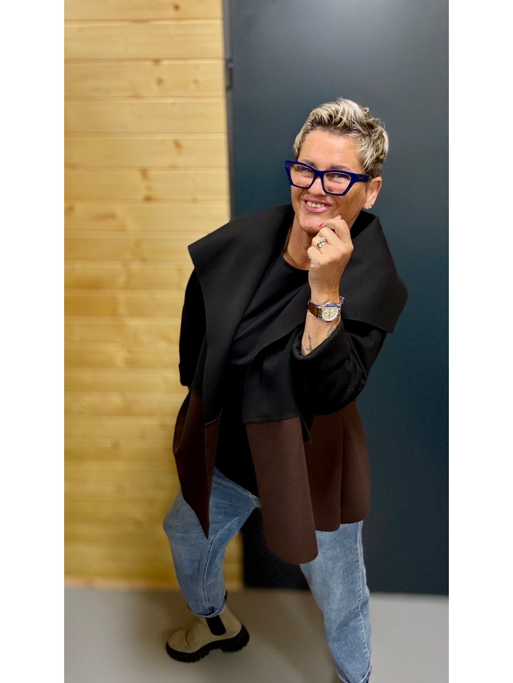 Elegantní kardigan s efektním velkým límcem, který vytváří krásnou siluetu a dodá každému outfitu šmrnc. Dvoubarevné provedení hnědé a černé z něj dělá nadčasový kousek, který sladíš téměř se vším.