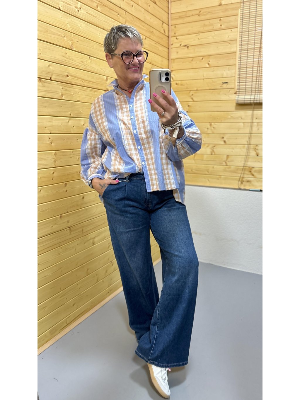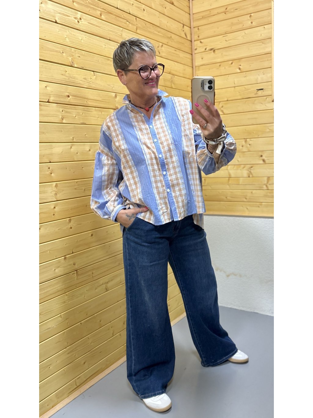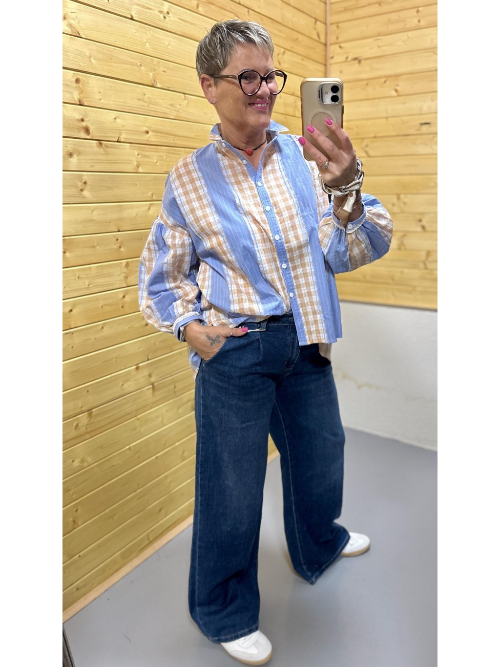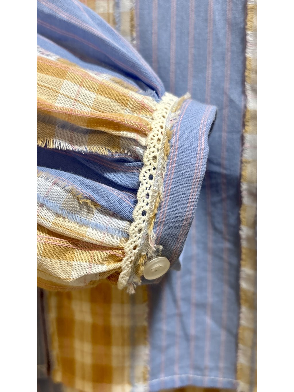 Lehká bavlněná košile s hravou kombinací modrých proužků a béžové kostky, doplněná jemnou krajkou na rukávech. Pohodlný volnější střih, který se nosí s lehkostí a stylem.