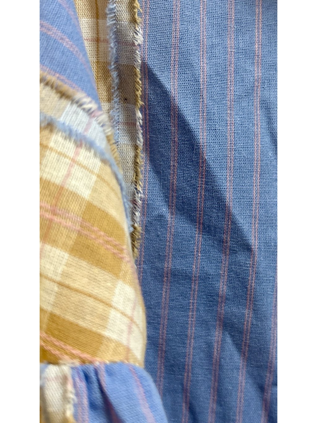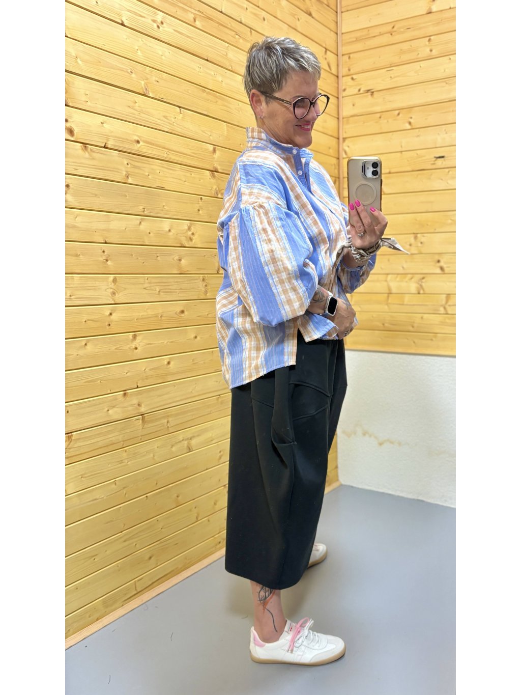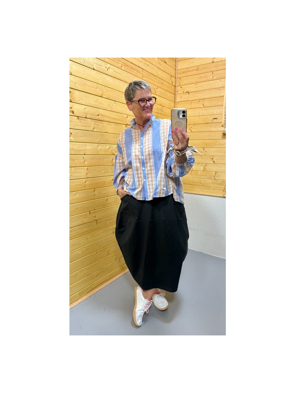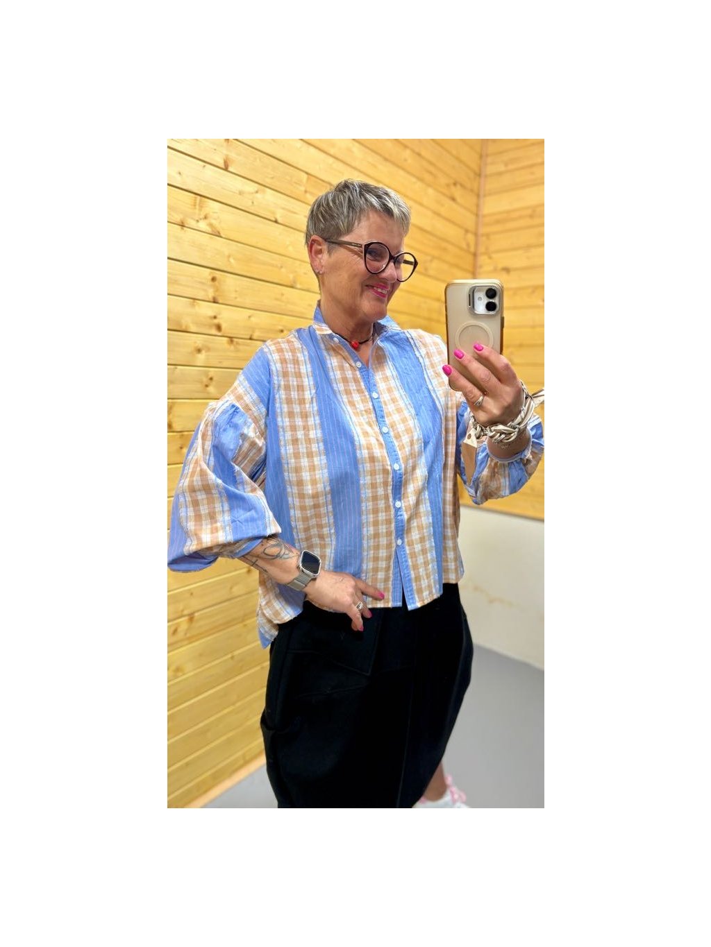 Lehká bavlněná košile s hravou kombinací modrých proužků a béžové kostky, doplněná jemnou krajkou na rukávech. Pohodlný volnější střih, který se nosí s lehkostí a stylem.