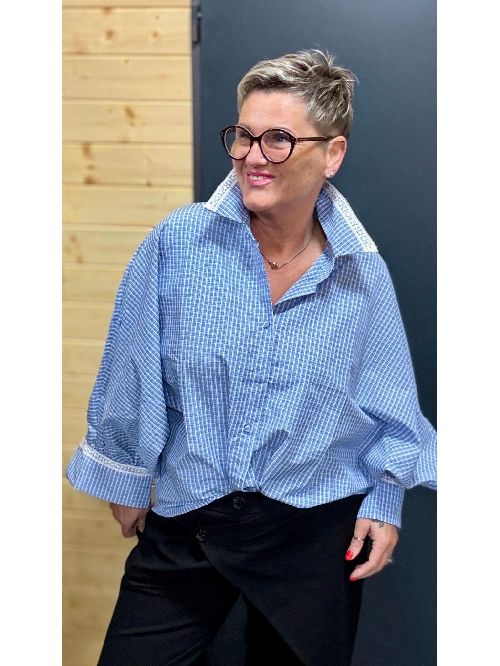 Volná košile s jemnou krajkou na límečku a rukávech, netopýřím rukávem a látkou potaženými knoflíky. Pohodlný střih, který si rozumí i s větším poprsím a dává outfitu ženský detail.