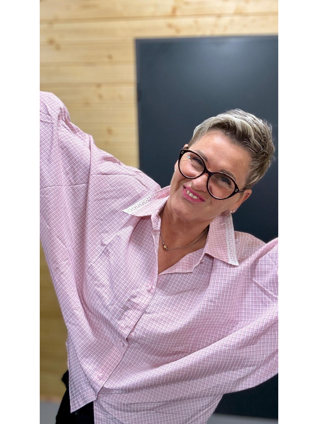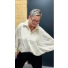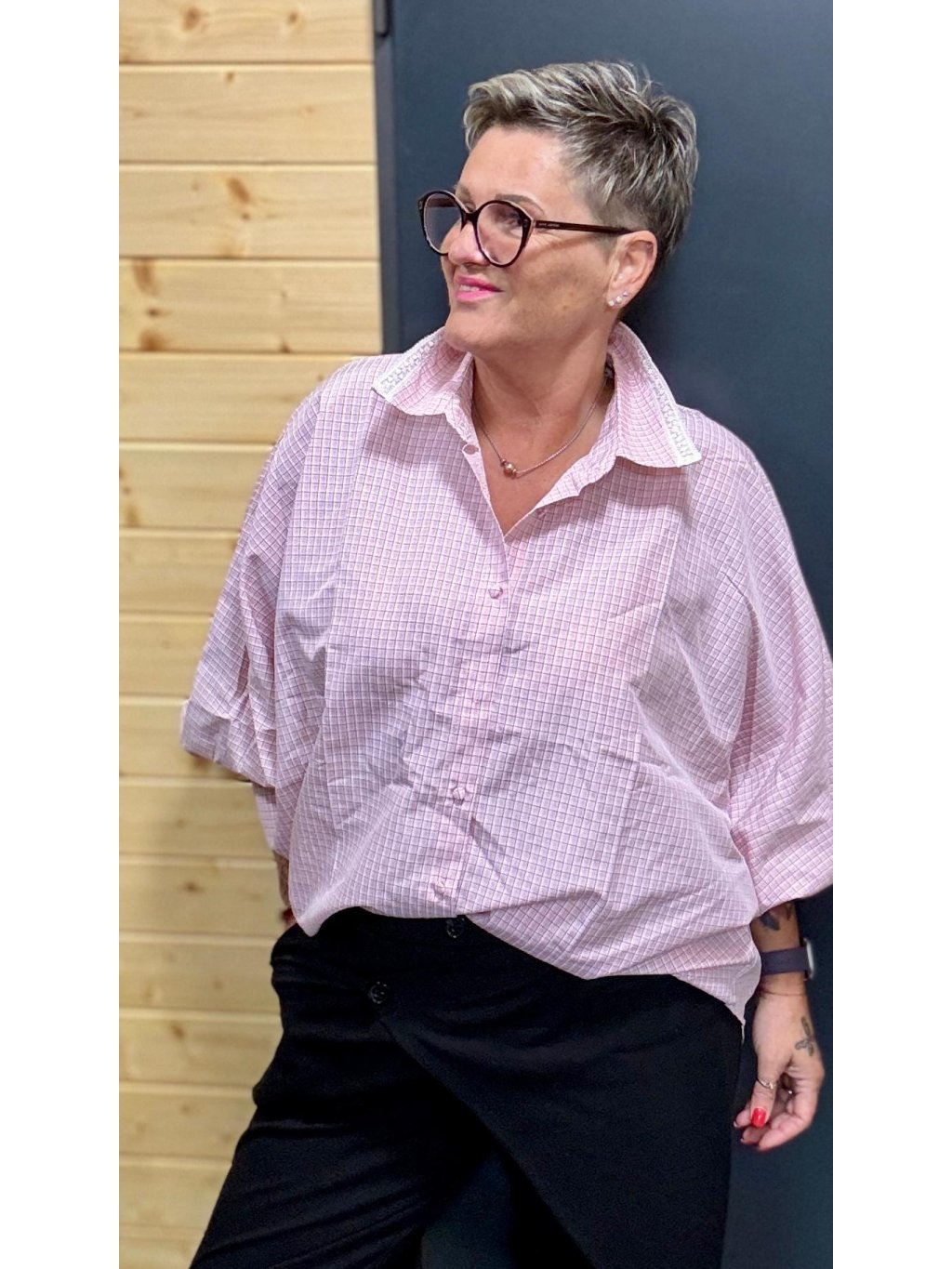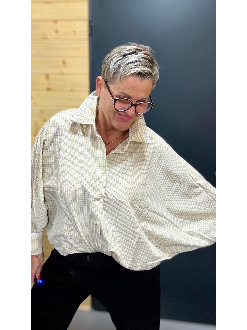 Volnější střih s netopýřím rukávem poskytuje maximální pohodlí a krásně se přizpůsobí postavě – bez pnutí, bez omezení pohybu. Košile je proto ideální i pro ženy s větším poprsím nebo širšími rameny.
