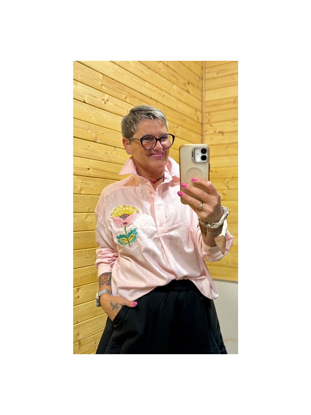 Košile, která kombinuje klasiku s výrazným detailem. Vyšívaná květina na levé straně dodává modelu osobitost a ženský šmrnc.