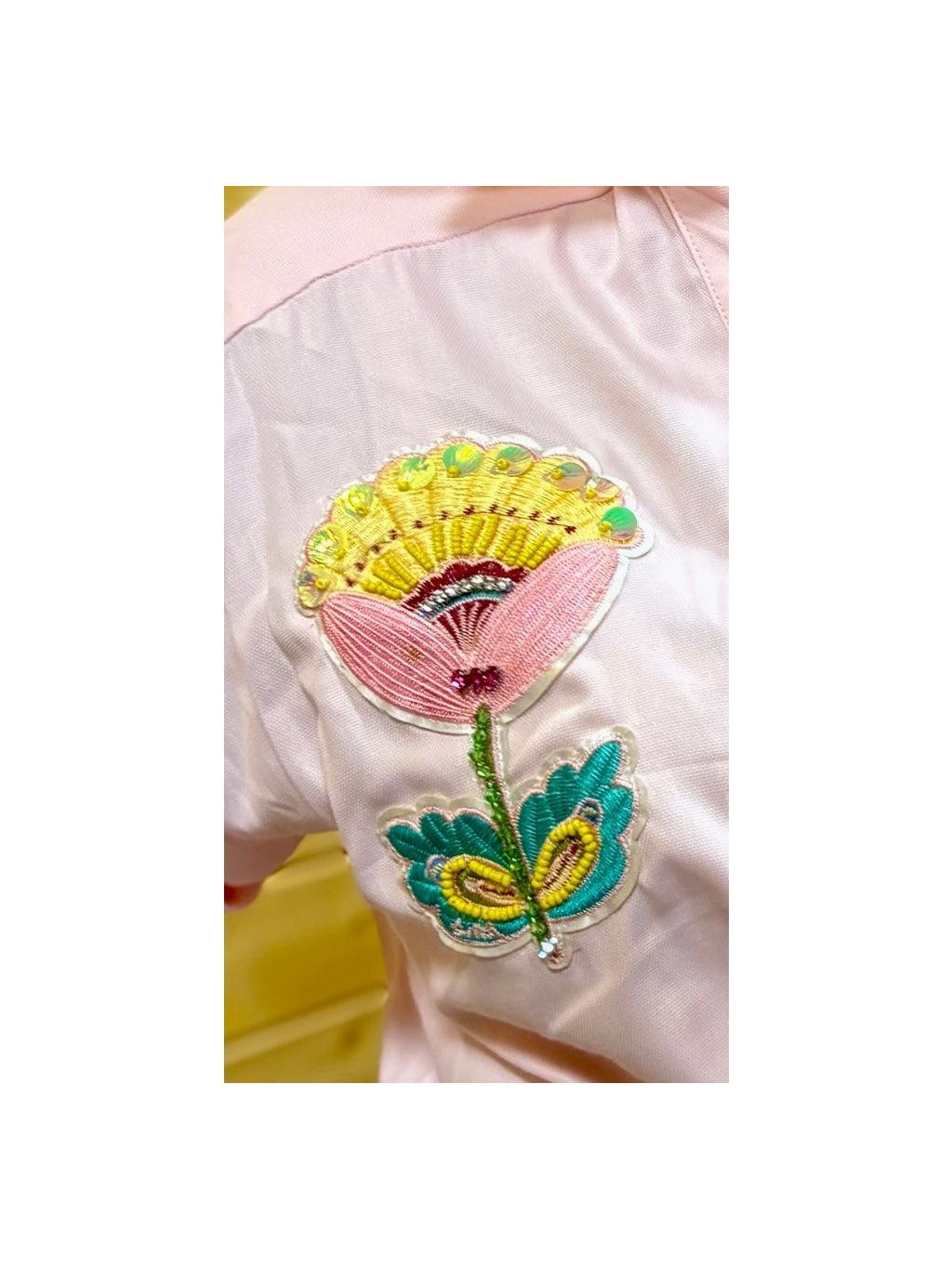 Vyšívaný motiv květiny není jen ozdoba – symbolizuje ženskou sílu, jemnost a originalitu. Každý kousek působí lehce jinak, což z něj dělá malý originál.