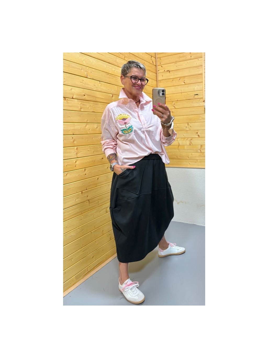 Střih je volnější, příjemně splývavý, s prodlouženým zadním dílem – ideální do kalhot, sukně i jen tak ledabyle přes boky. Materiál je lehký, pohodlný a dobře se nosí po celý den.