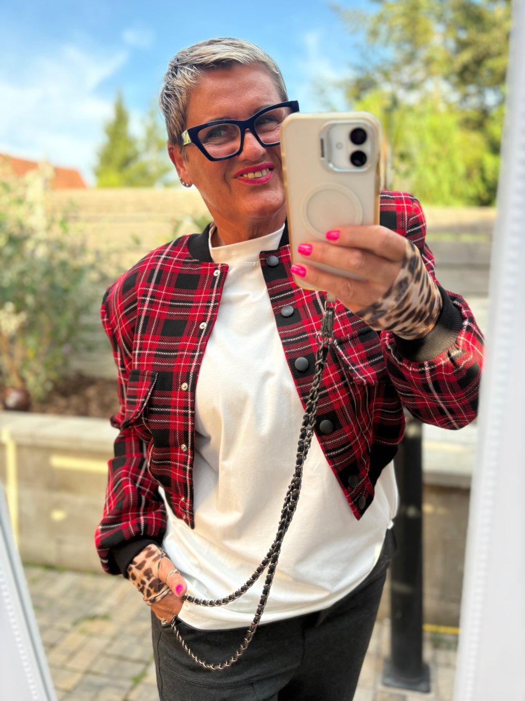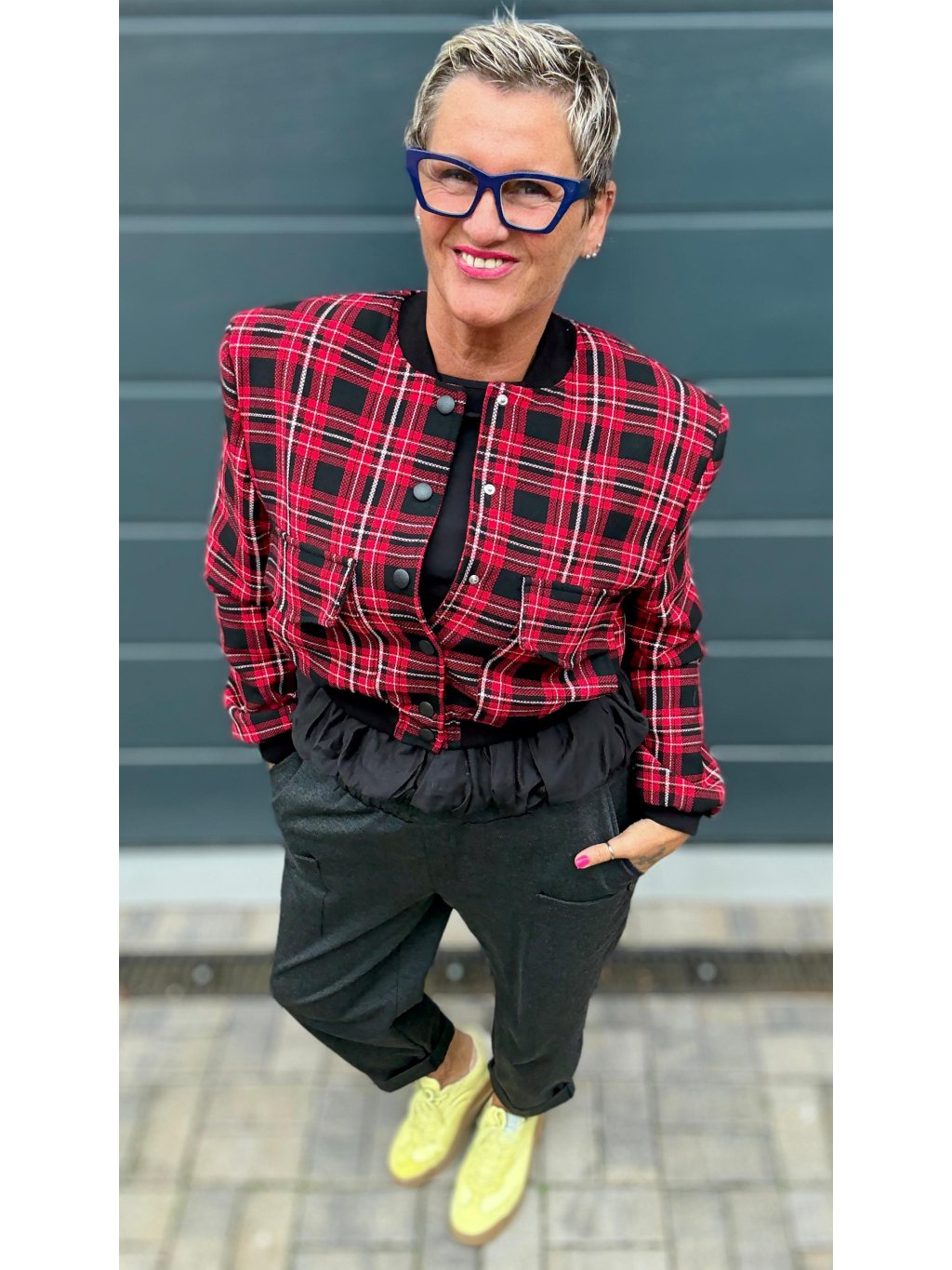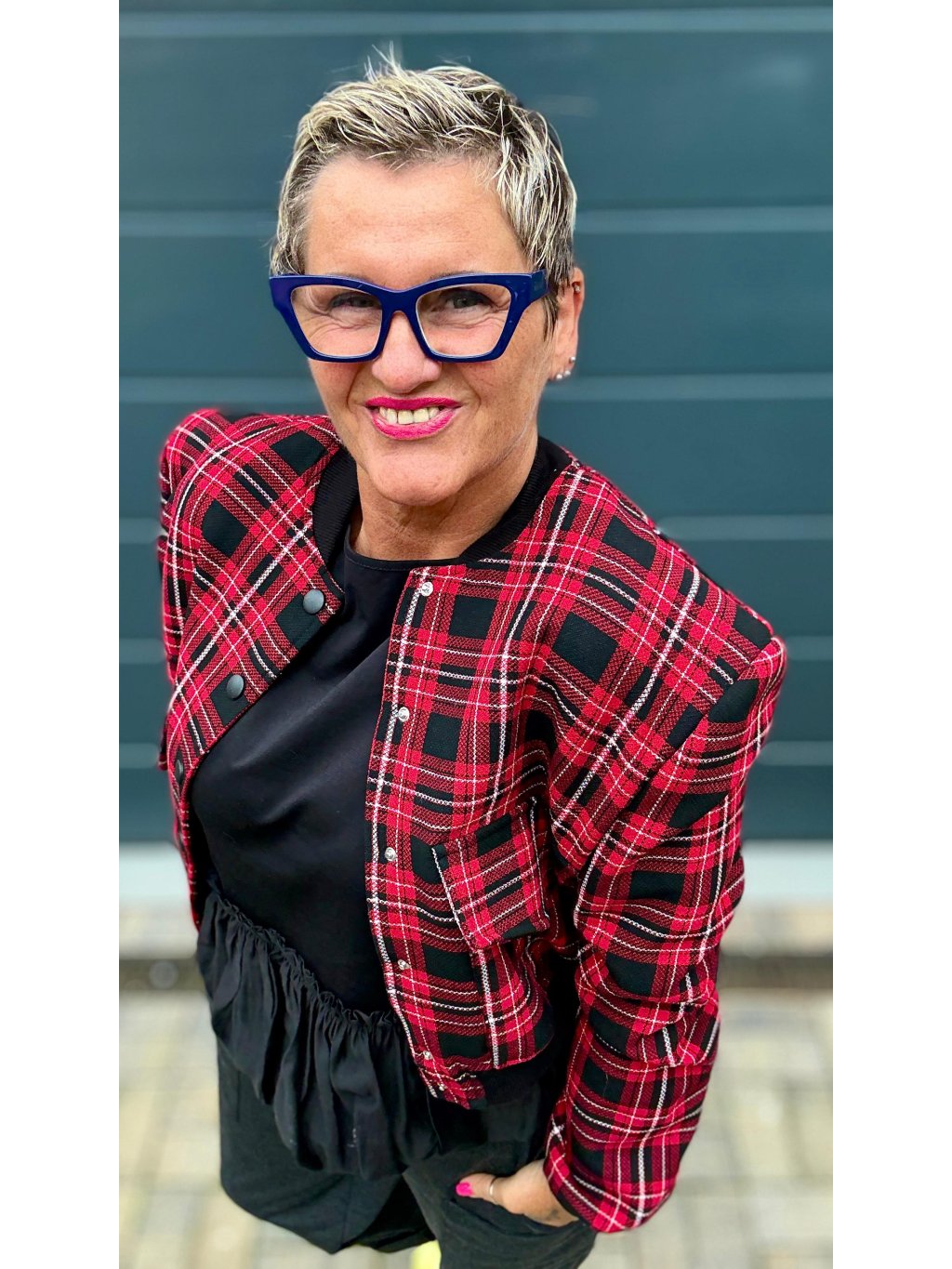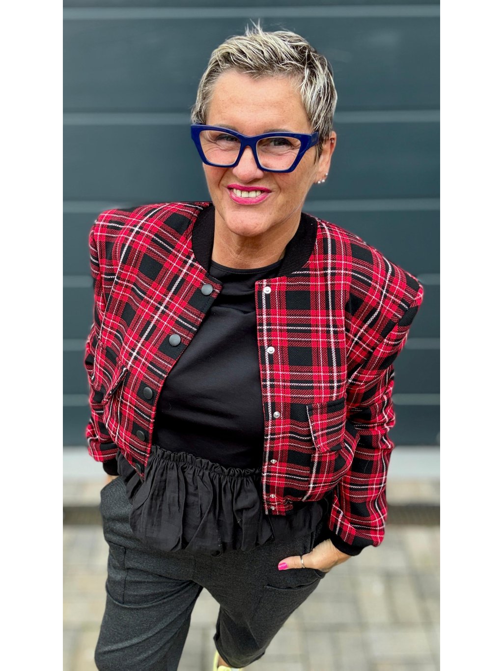 Stylová kratší bundička v červeno-černém kostkovaném vzoru, která dodá šmrnc i jednoduchému outfitu.