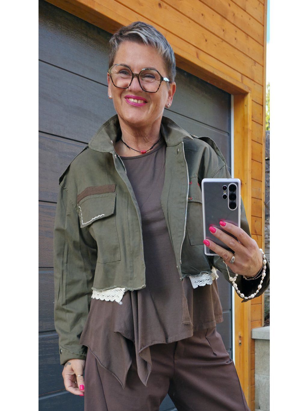 Lehká krátká bundička do pasu, která na první pohled zaujme svými drobnými detaily. Na přední části najdete dvě kapsy na prsou doplněné jemnou výšivkou a ozdobnými prvky. Spodní lem je zakončený jemnou krajkou, která dodává bundičce ženský nádech.