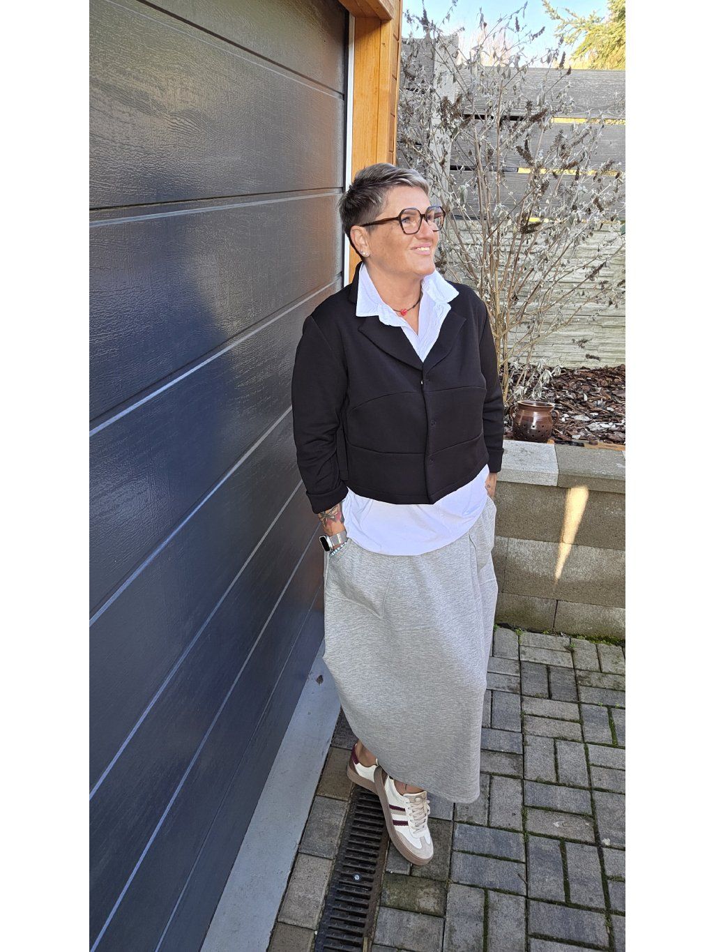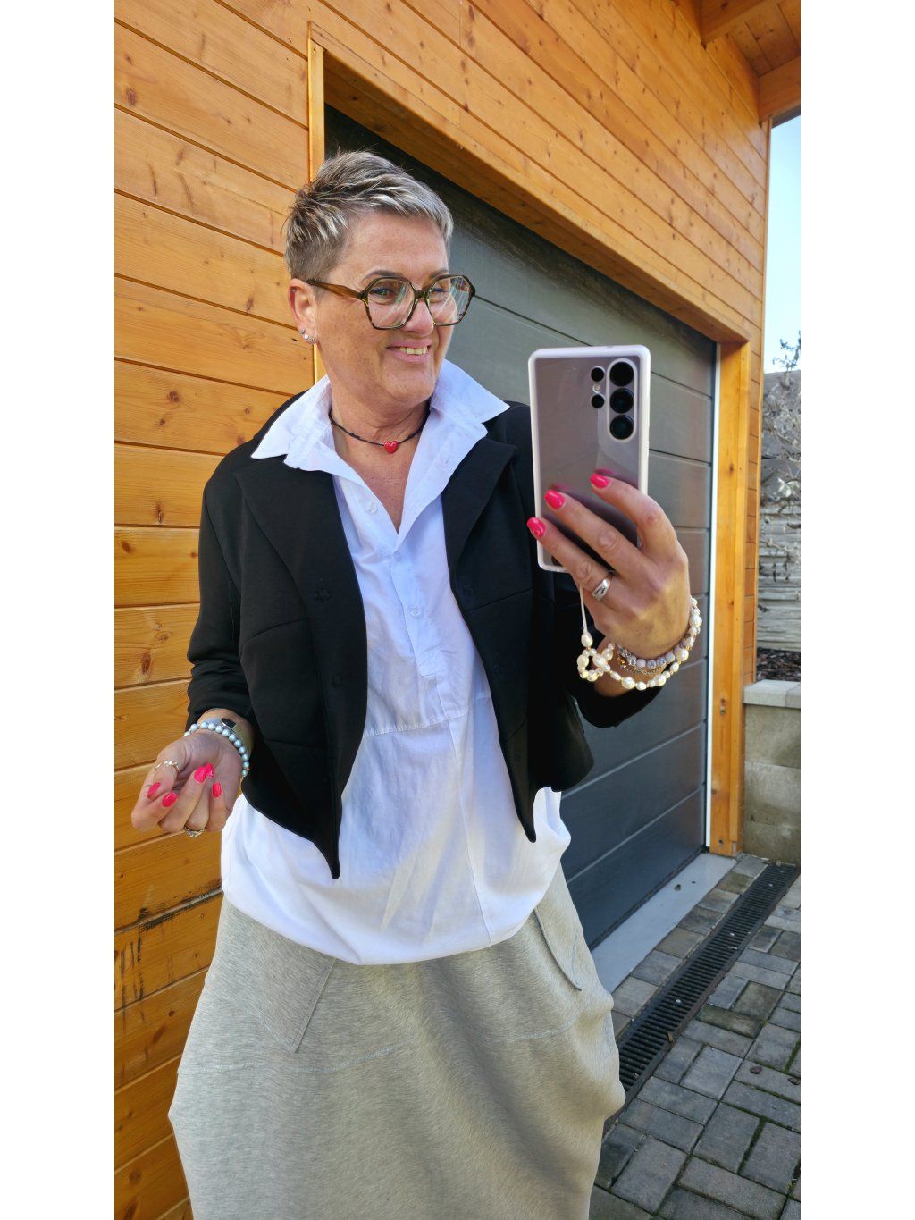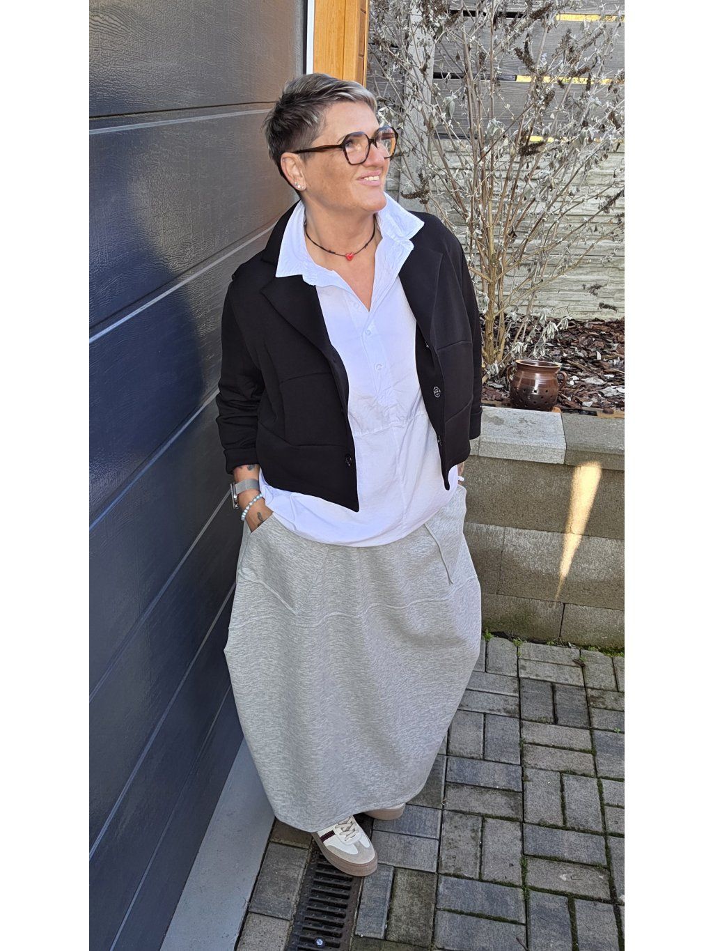 Délka je ideální k šatům, sukním i kalhotám s vyšším pasem. Skvěle funguje jako elegantní vrstva přes košili, top nebo jednoduché šaty.