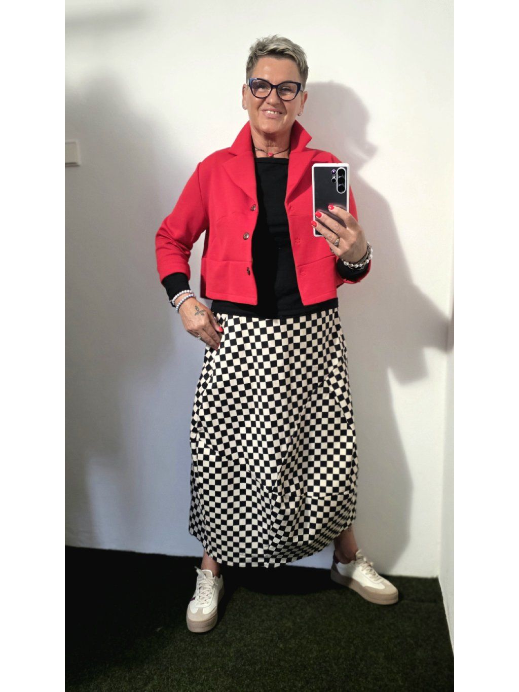 Krátká délka saka opticky prodlužuje nohy a vytváří moderní proporce – zvlášť v kombinaci s vyšším pasem.