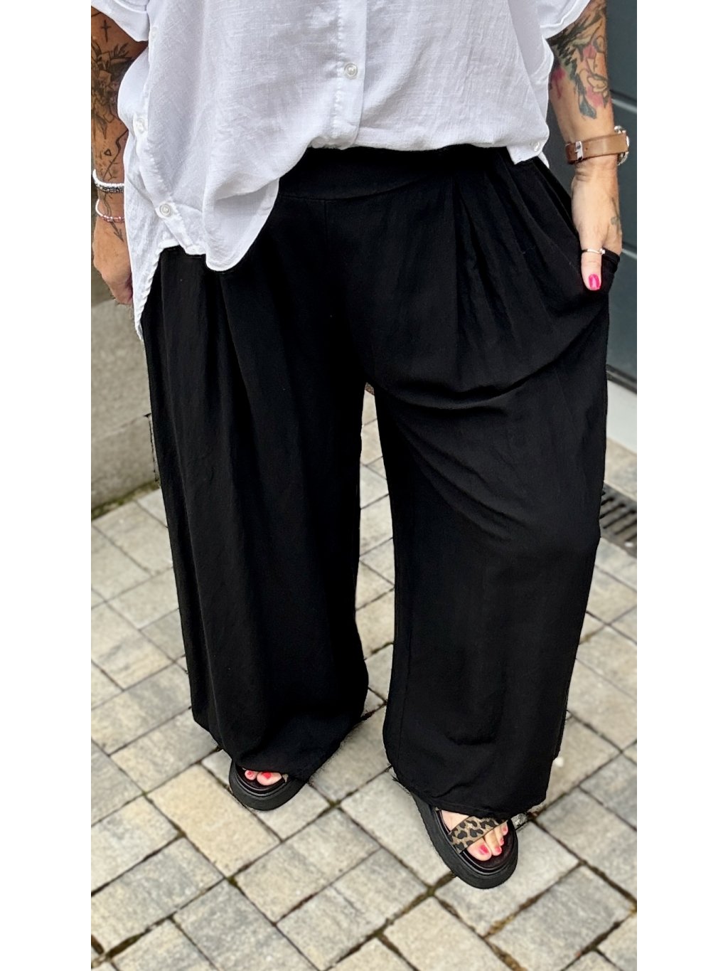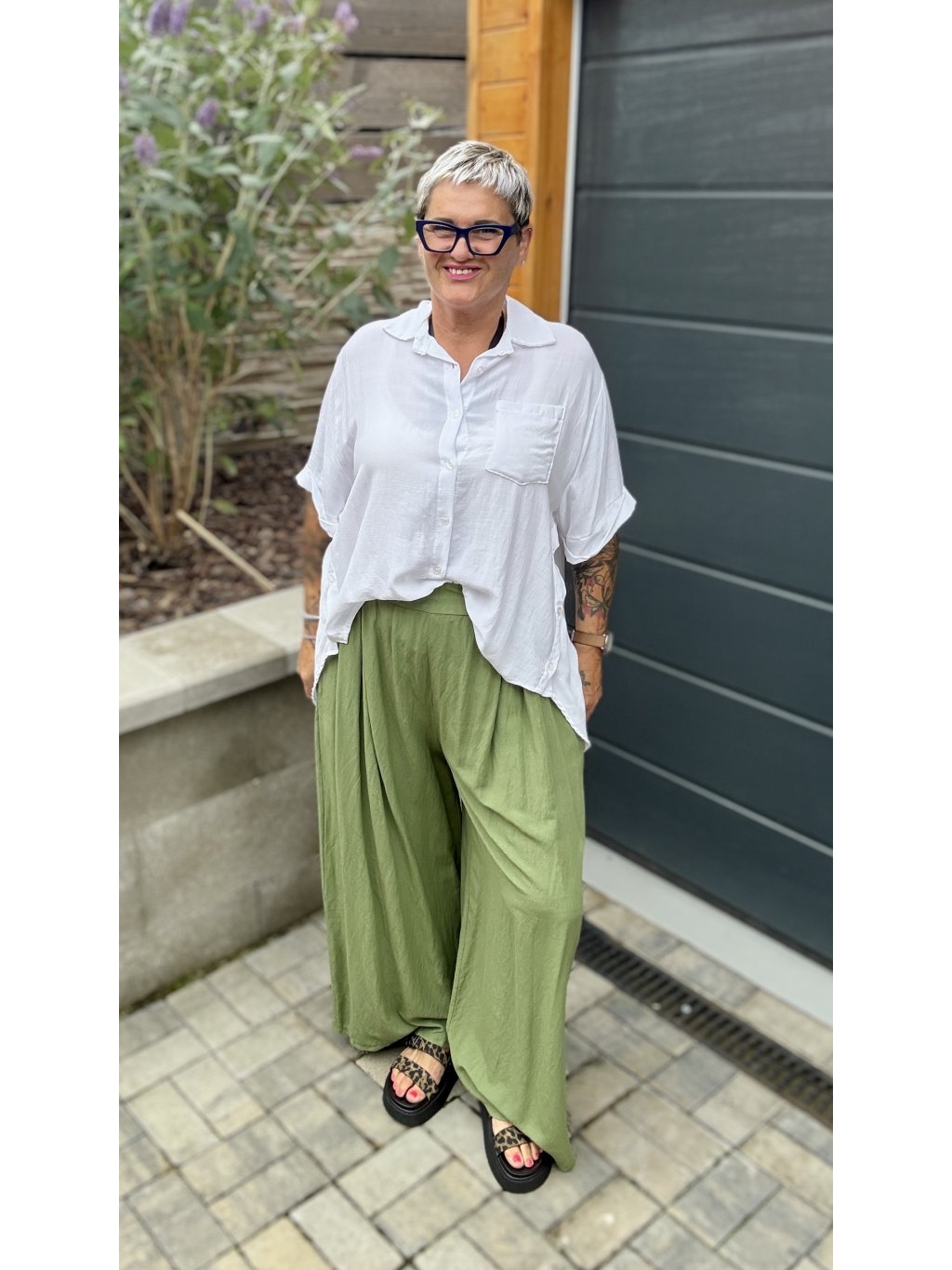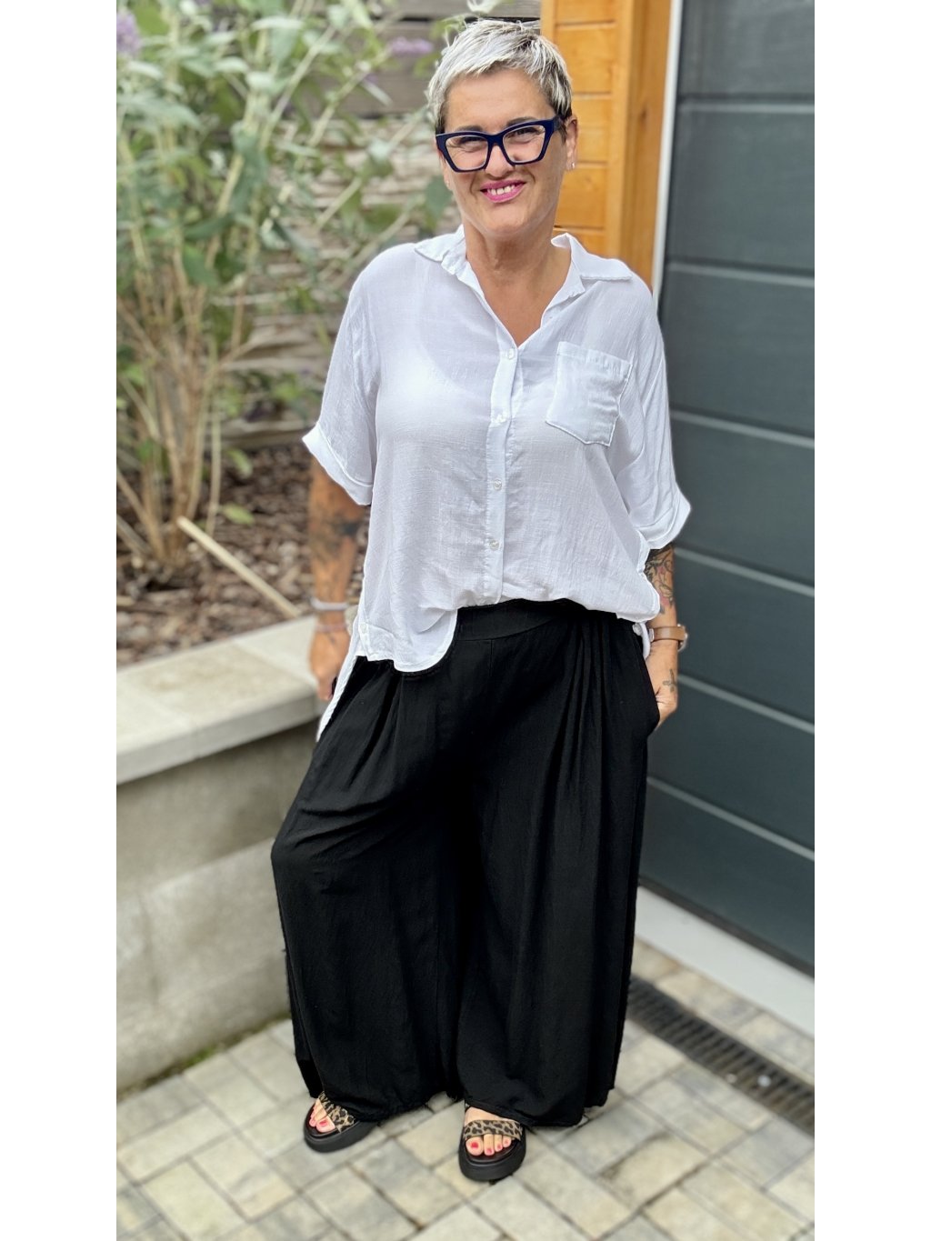 Tyhle volné kalhoty jsou must-have kouskem letní sezóny! Jsou lehoučké, neskutečně příjemné na těle a díky pružnému pasu skvěle sedí. Volný střih poskytuje absolutní volnost pohybu a díky jemnému skladu v pase krásně kopírují siluetu bez obepnutí. Ideální na výlety, práci i městský šrumec. Černá varianta je elegantní stálice, zelená dodá outfitu svěží šmrnc.